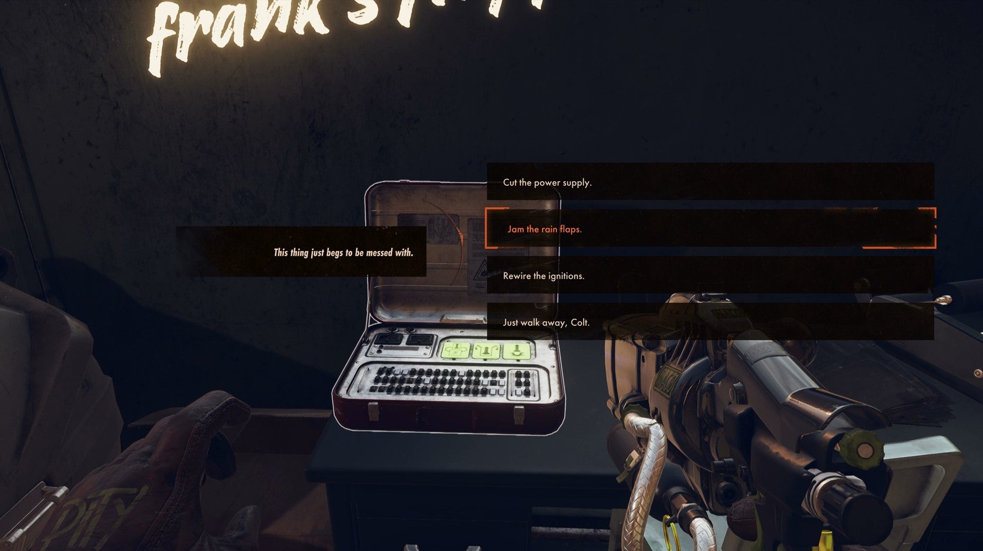 Take a look at the firework control box and there’s another problem: you don’t know which part to sabotage, let alone what would be deadly enough without Frank noticing.