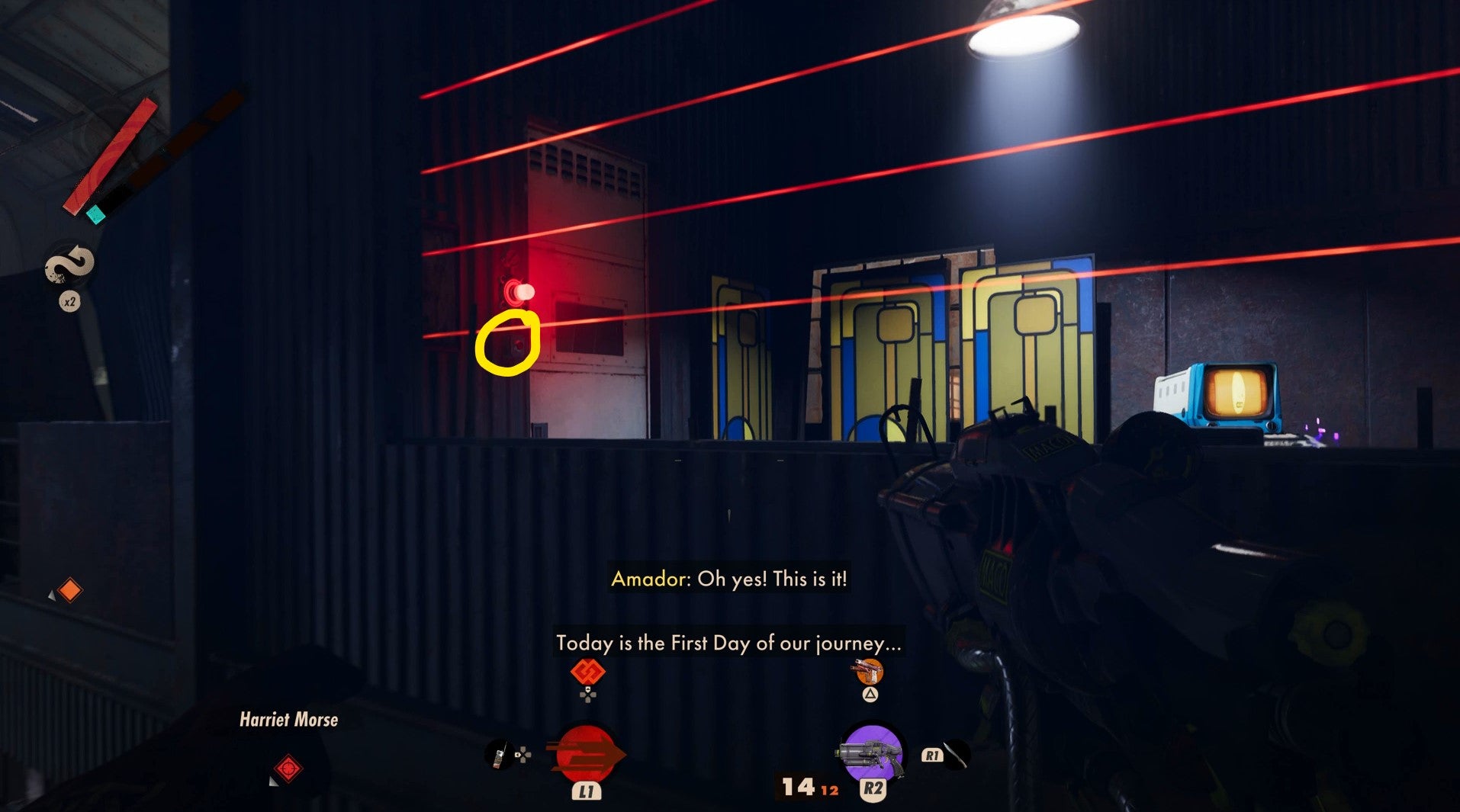 Follow this gantry all the way up towards Harriet. The door in front of you is locked, so look left and you’ll see a window obscured by lasers.