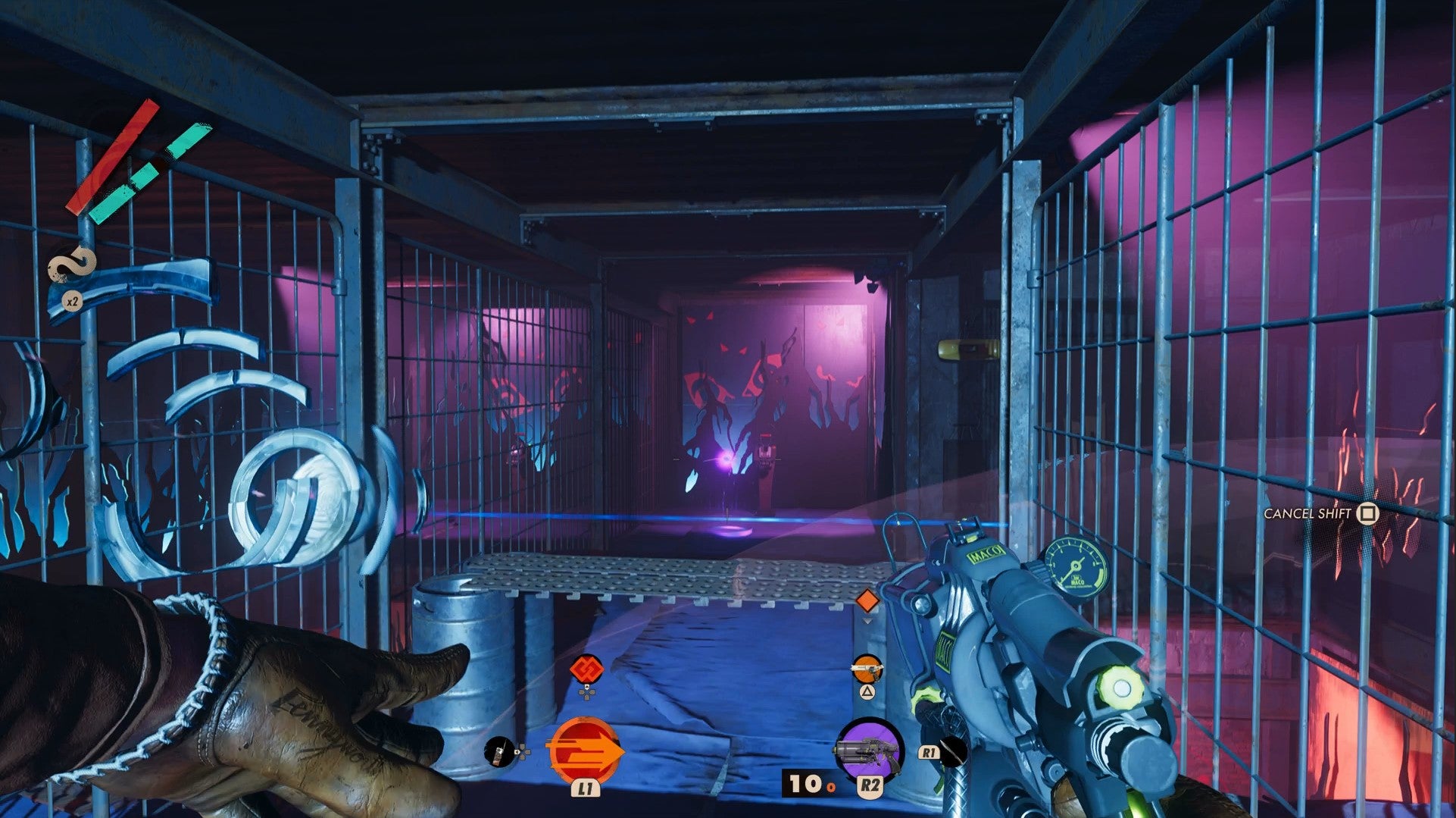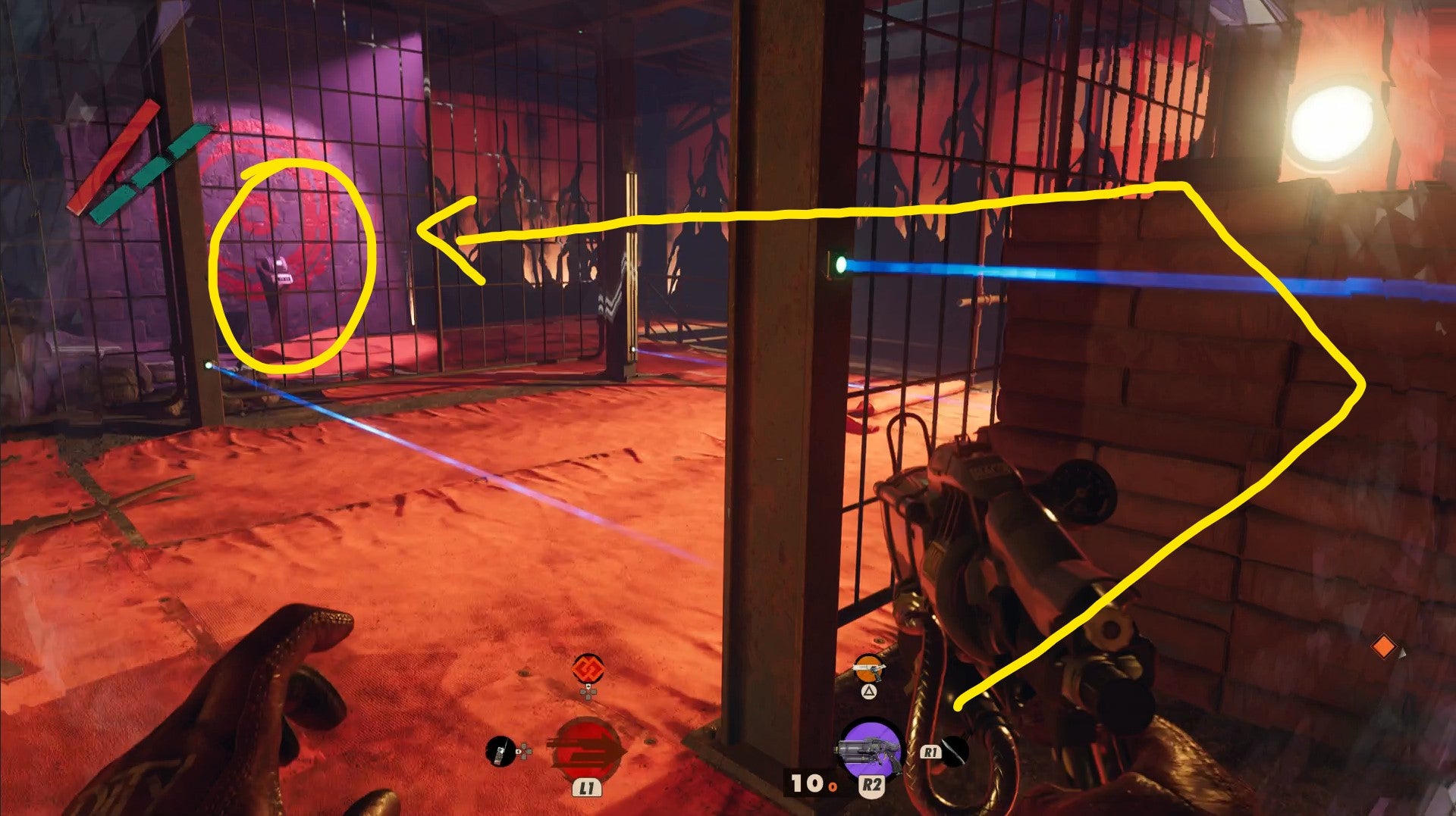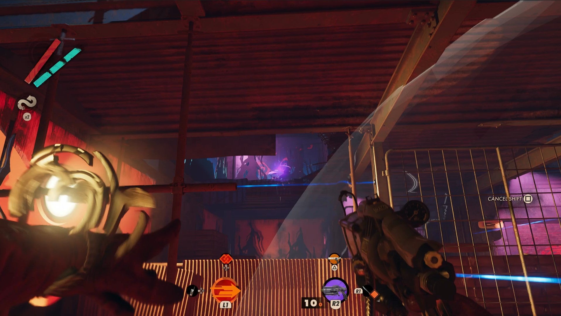 From there, you can see the next lever on the other side of this floor, through the grates. Crouch under the laser to your right, then hop over the next. Then you're out of the Slab nullification field to Shift past the other lasers.