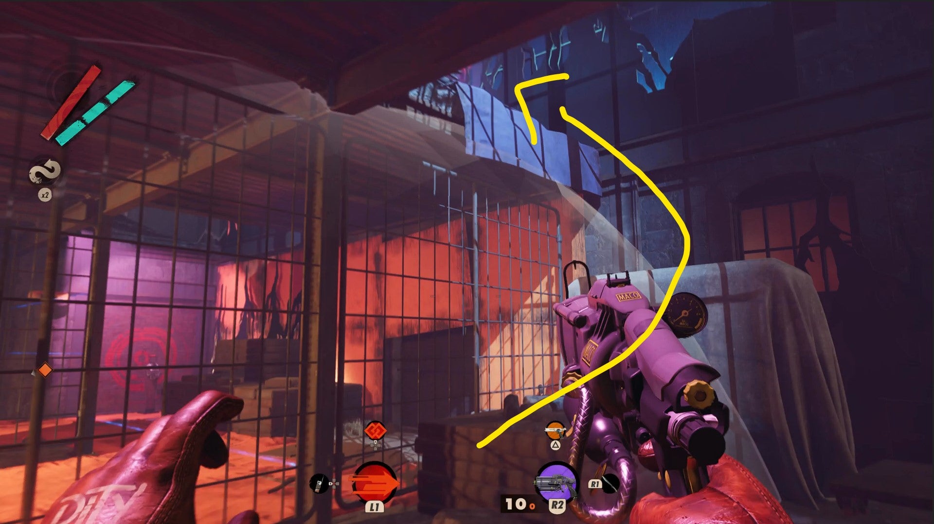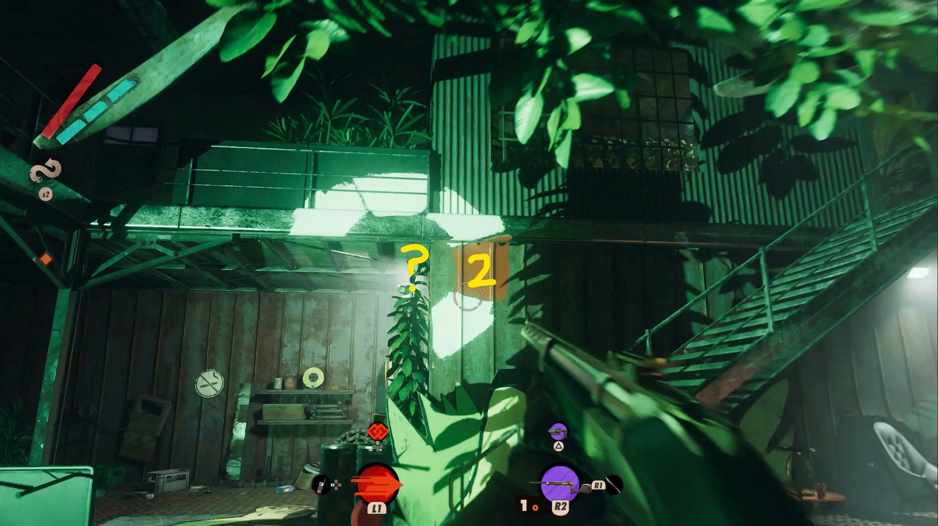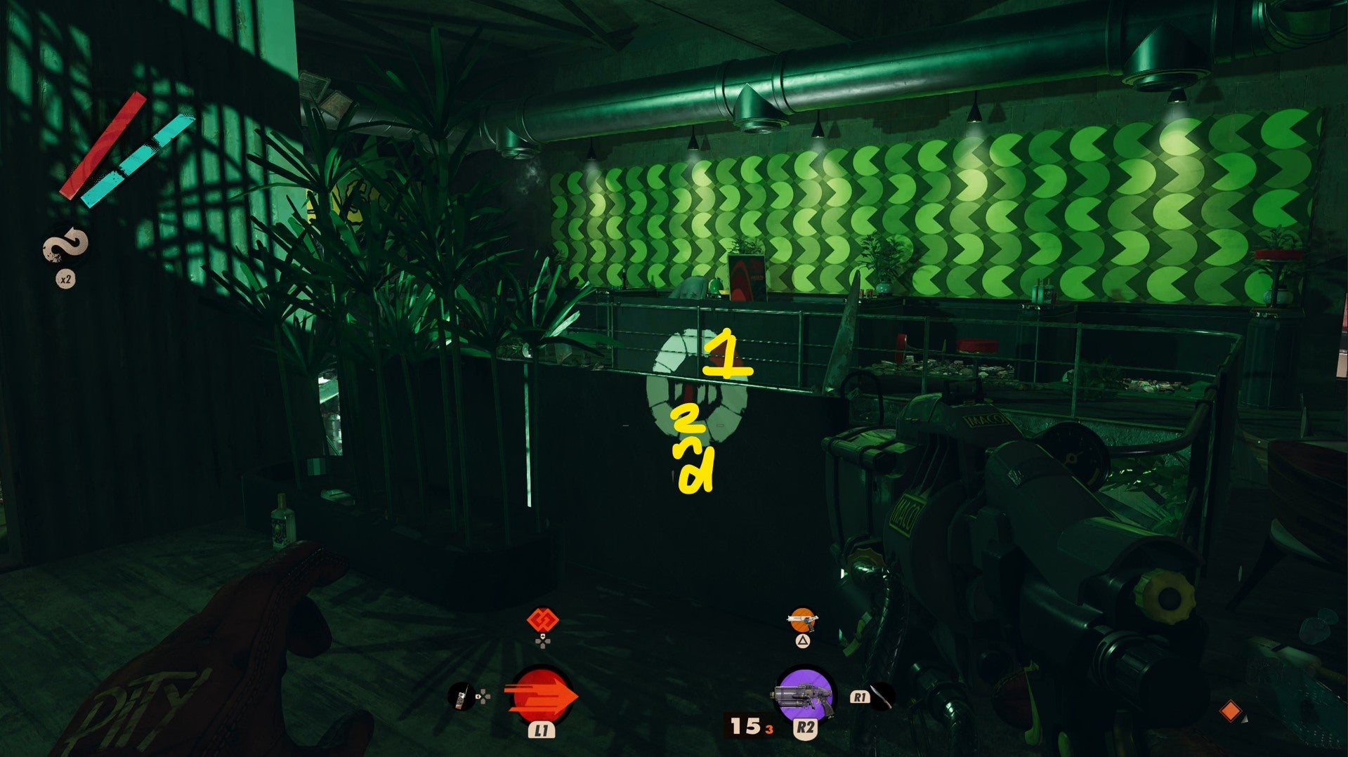 If you want to remove an element of danger and clear the gas, take a left through Harriet’s door (or Shift through the lasers if it’s not open) then down the stairs and to the right. In Harriet’s pulpit there’s a lever on the right that dispels the green gas.