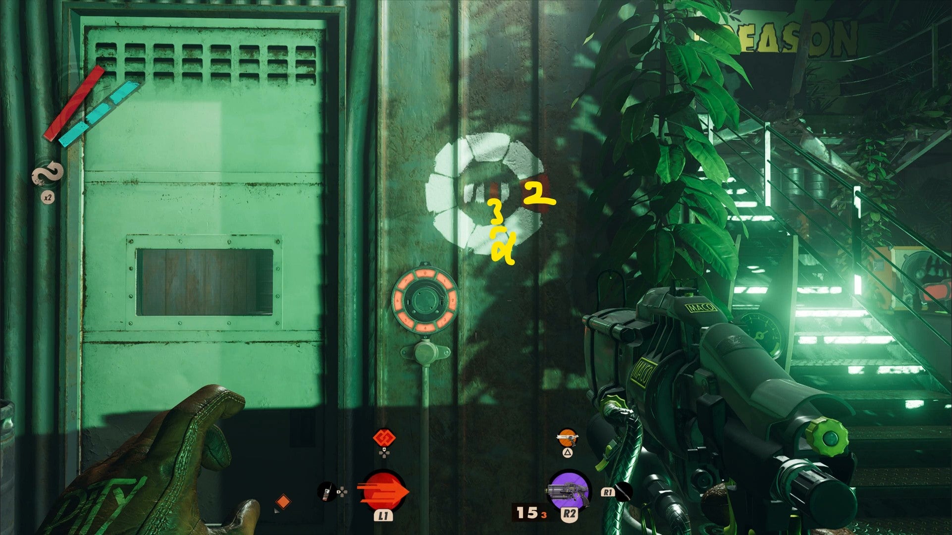 You’re looking for four painted white circles with one red block showing the number on the circular code lock you need to press.