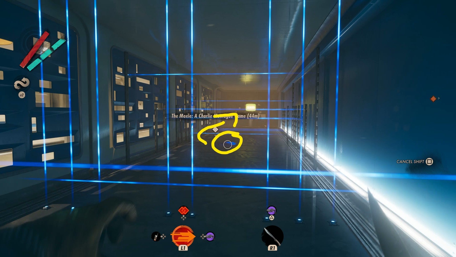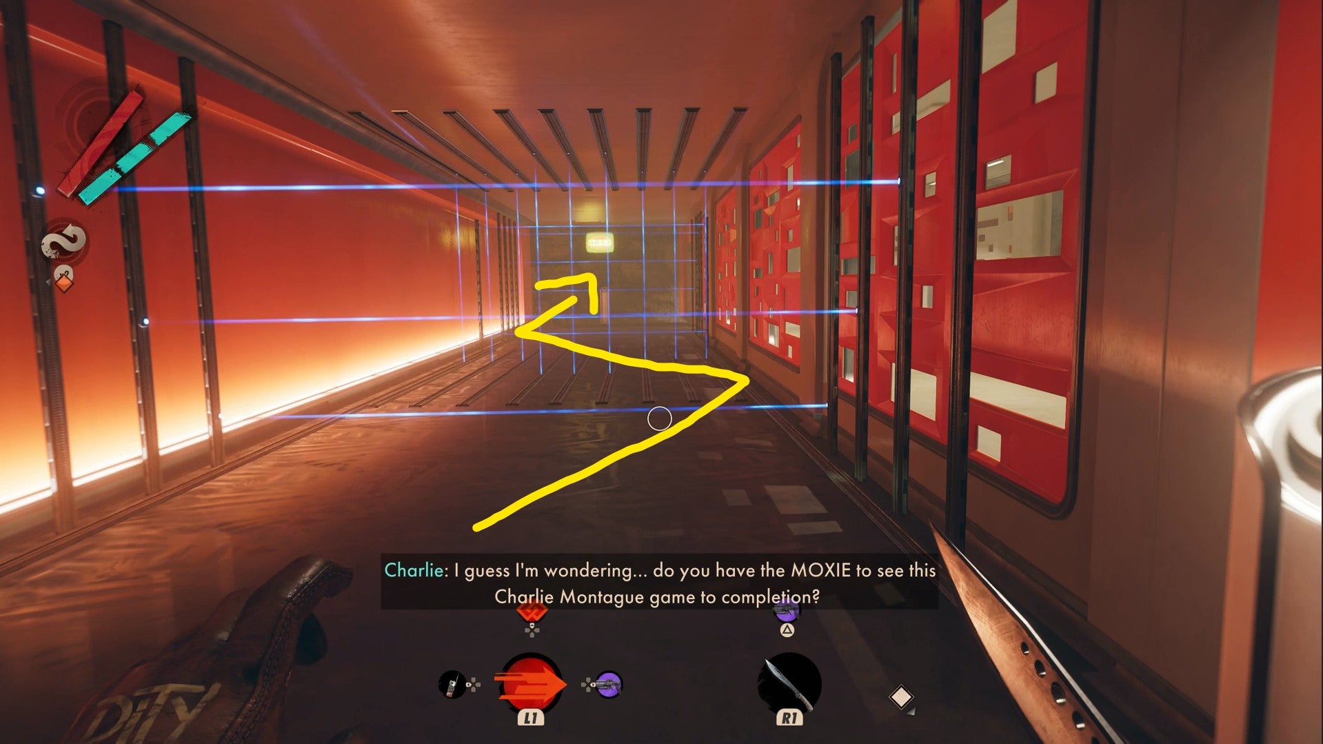 Duck under the first beam, then shift past the row of 5 moving side-to-side. Move up forward when there’s room if you don’t have the Reach upgrade to get far enough. Next, you can just Shift through the remaining lasers.