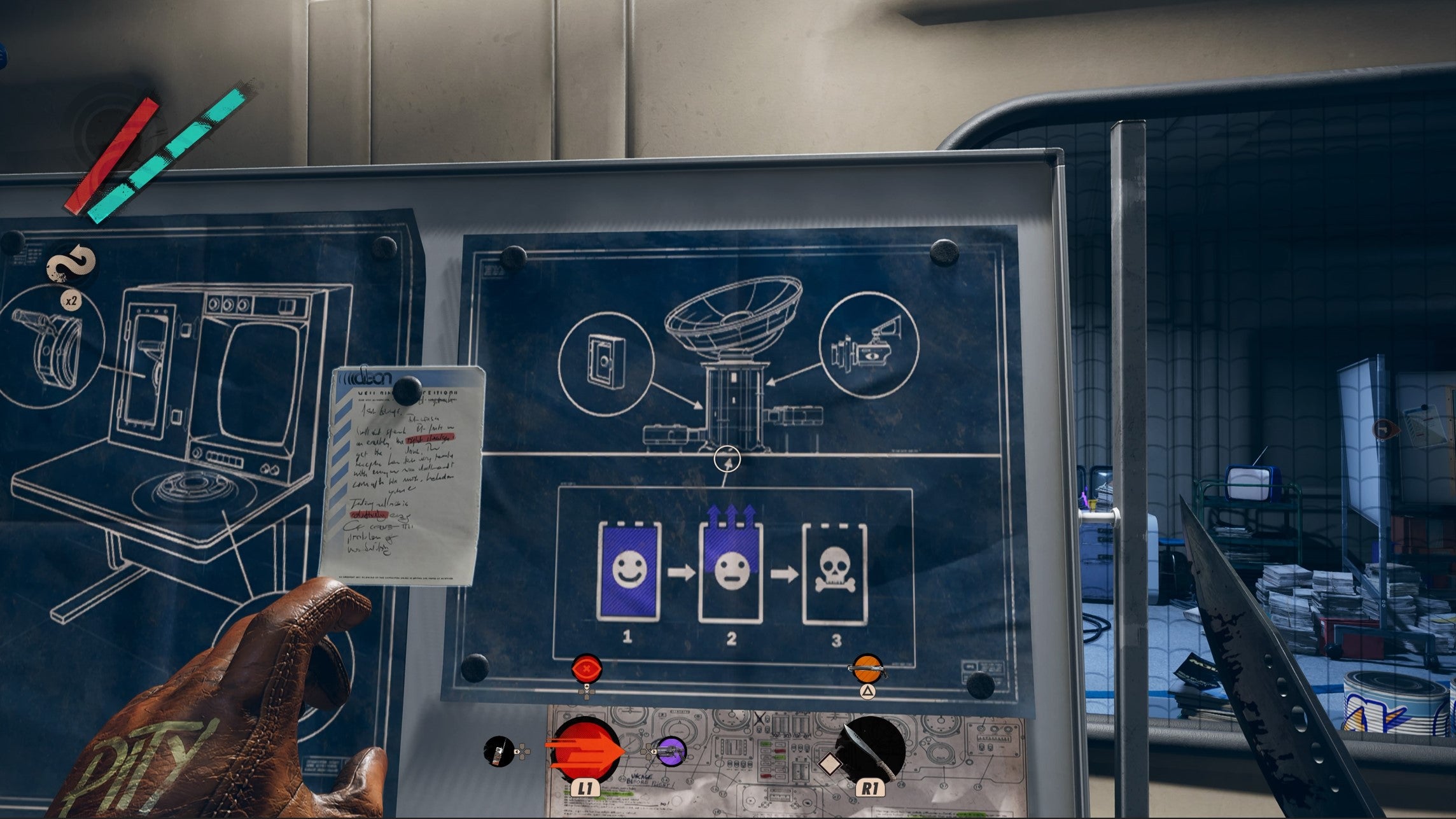 You can grab some information that eventually helps you assassinate Aleksis in here if you want, but for the task at hand continue around the corner and take the note from the desk in the corner.