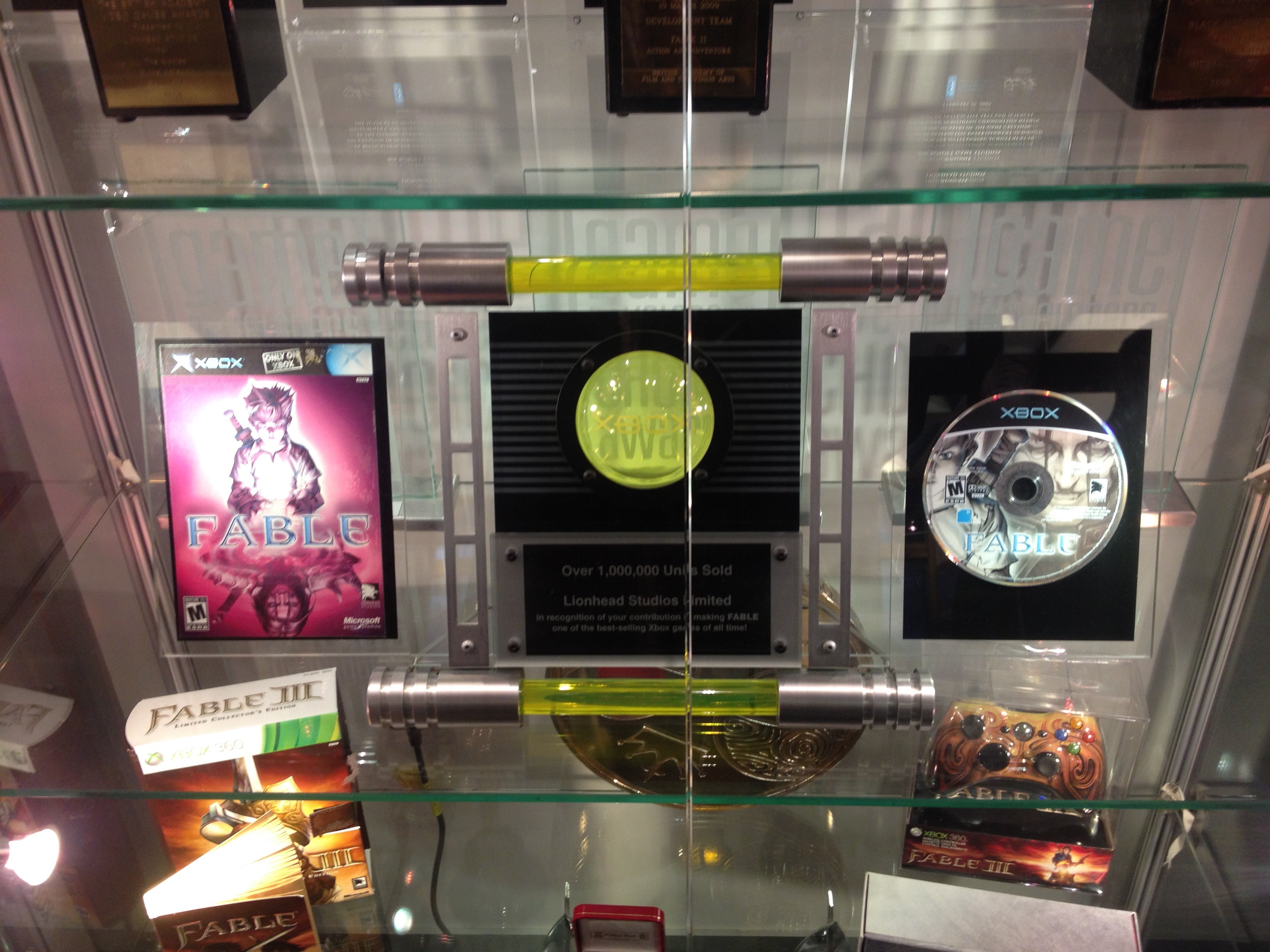 This is my first visit to Lionhead, which I am ashamed to admit. No time for moping; there's a form to sign and a trophy cabinet to admire. A couple of Interactive Achievement Awards; three BAFTAs; four custom Xbox 360 consoles; a special disc to celebrate 1m sales of the first Fable game; a special edition that was never released because of a manufacturing problem; and a giant coin behind a smaller coin, the former a treasure once hidden as part of a promotional stunt, the latter the reward for fans who found it.