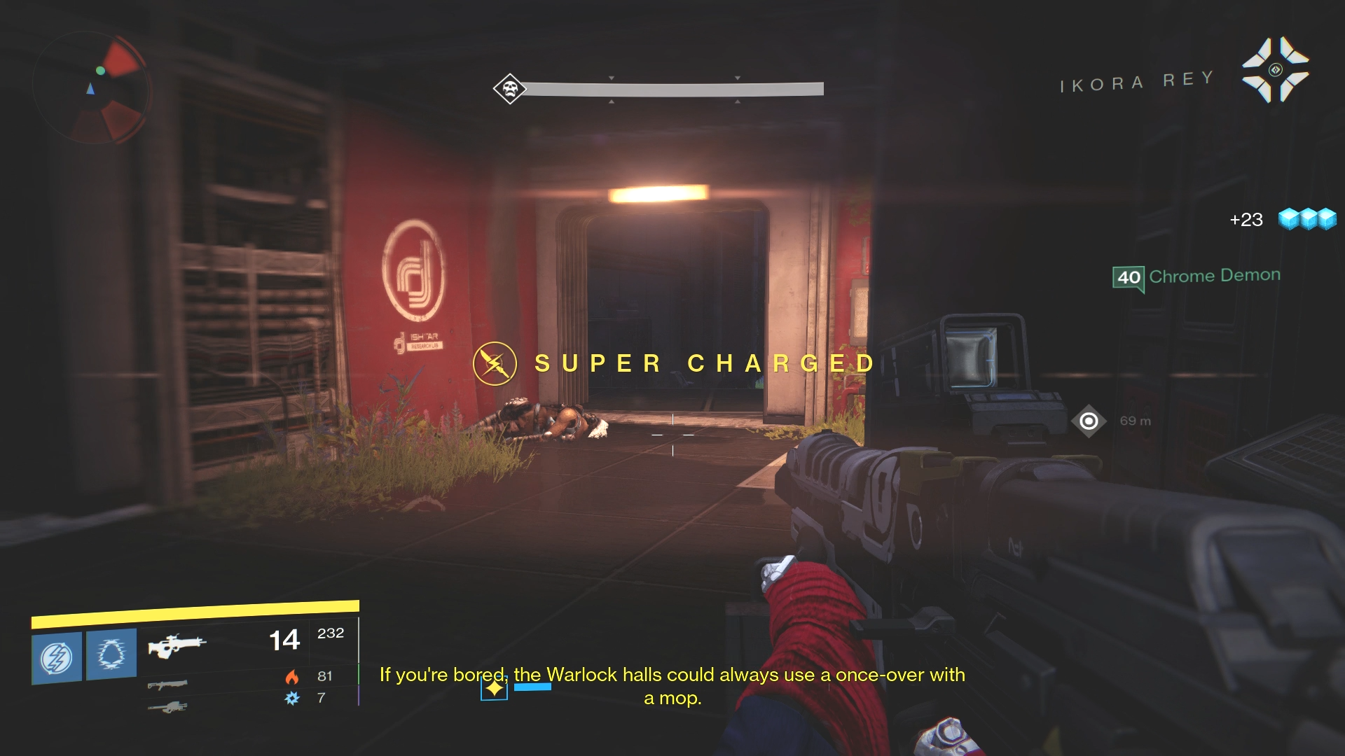 “If you’re bored,” she says, “the Warlock halls could always use a once-over with a mop.”