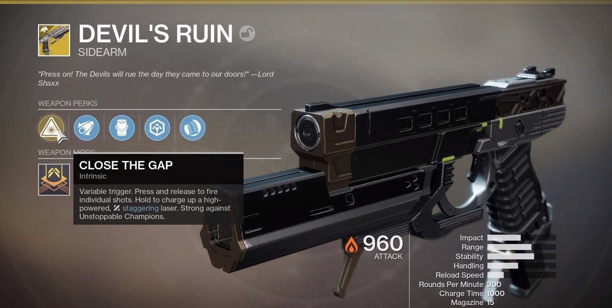 The first Exotic quest in the Season of Dawn rewards you with the Devil's Ruin Solar sidearm. It comes with the Close the Gap intrinsic perk, which provides it with a variable trigger that allows you to press and hold for a high-powered, staggering laser or fire as you would normally for single shots. It also comes with Pyrogenesis, where fully charging the laser refills the mag from reserves.