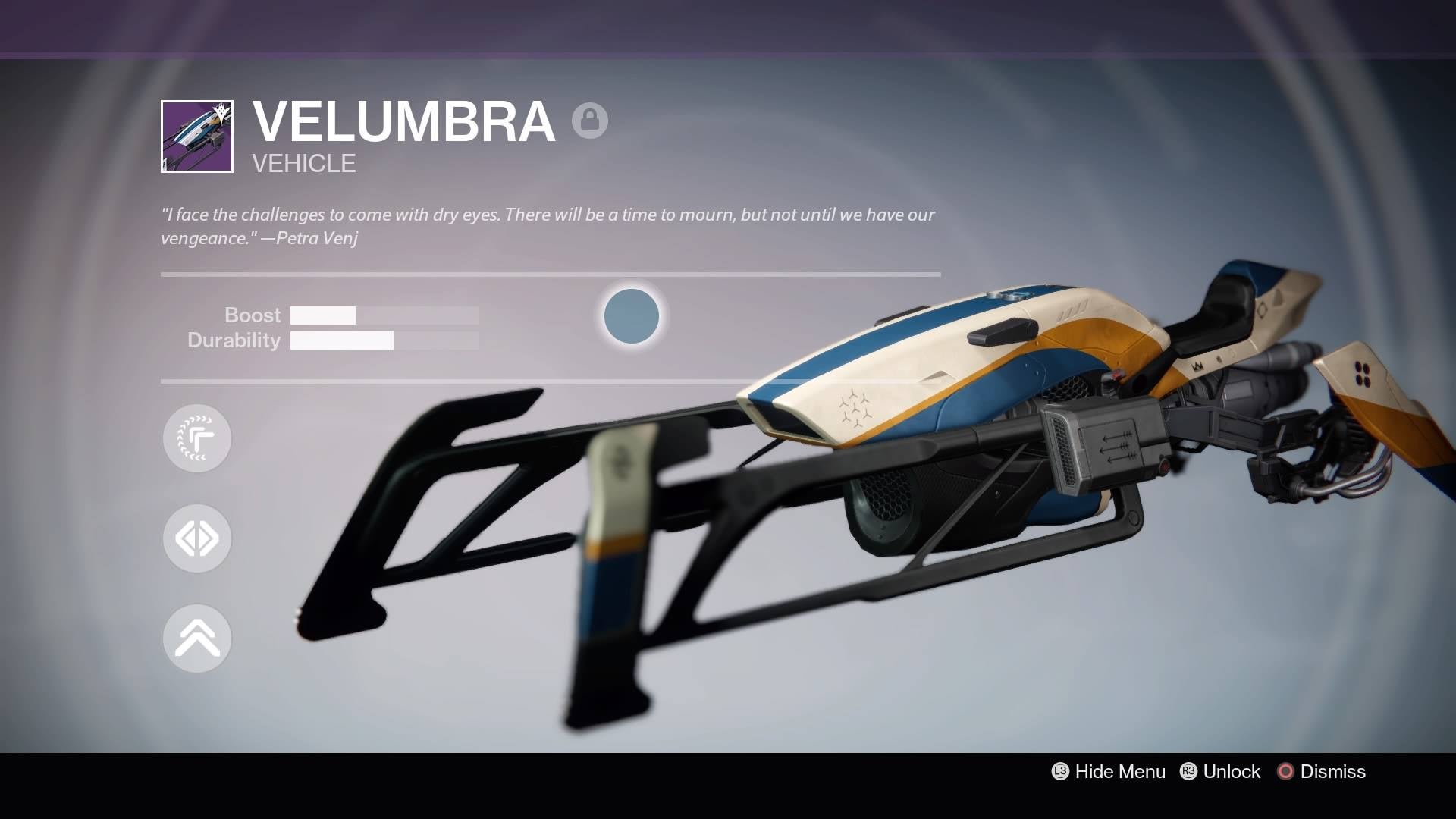 Stats-wise, it's comparable to the other legendary sparrows in Destiny, but the Velumbra comes with some cool stunt controls. If you hold R2 while airborne you can roll to the left and right with the left stick. You can also dart to the left and right with L1 or L3 and R1 or R3.
