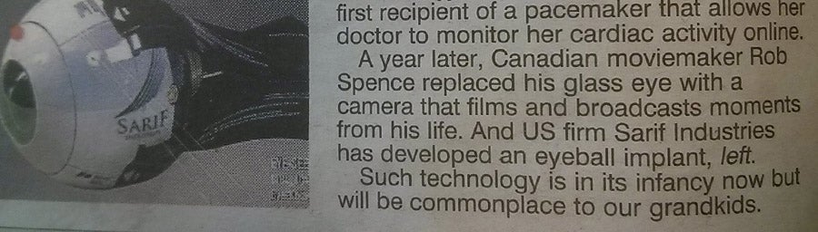Here's a delightful little blip: UK newspaper The Sun apparently ran a story on cybernetic implants this week, making mention of an eyeball implant manufactured by "US firm Sarif Industries". Sarif Industries is, of course, an entirely fictional company within the universe of Deus Ex, and the eyeball shown is a piece of Eidos Montreal's concept art from Human Revolution. Here's a picture of the story in situ, although we can't confirm its veracity. It's good timing for Square Enix, though; the publisher is currently promoting the Director's Cut re-release of Deus Ex: Human Revolution, which drops this month on Mac, PC, PlayStation 3, Wii U and Xbox 360.