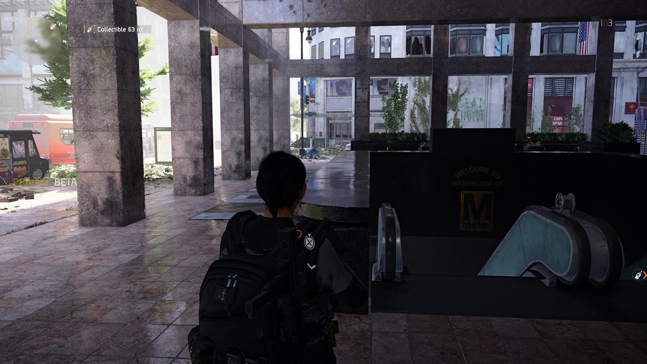 To reach this Comms, we have to go via the underground, so enter the metro at the intersection of 12th St NW and F St NW. Follow the path around and go up the escalator. Go straight towards the HxC store and stay over to the left. You'll see an open area. The artifact is at the entrance at the foot of the toy soldier out here.
