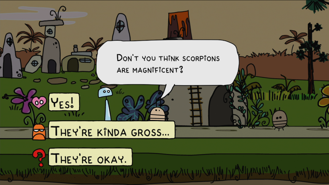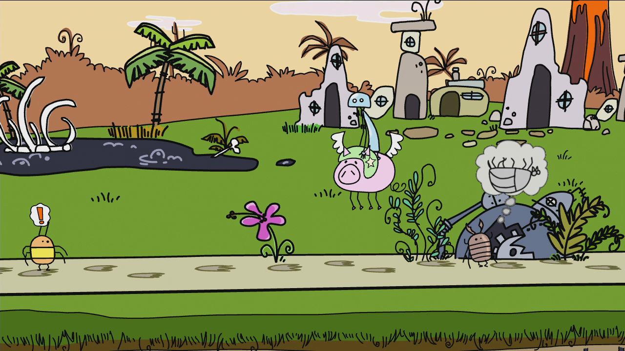 From a visual perspective, Doki-Doki Universe is absolutely delightful. Made up of colorful, squiggly line drawings, the game operates in two dimensions. Nothing is rigid, nothing is perfectly drawn. Everything about the world shares the same qualities as a children's sketchbook which, given the tone, works just fine. The music, on the other hand, is a little less enchanting. Though it originates from the same bubbly place as the graphics, the audio can occasionally get repetitive enough to demand you switch to your own music.
