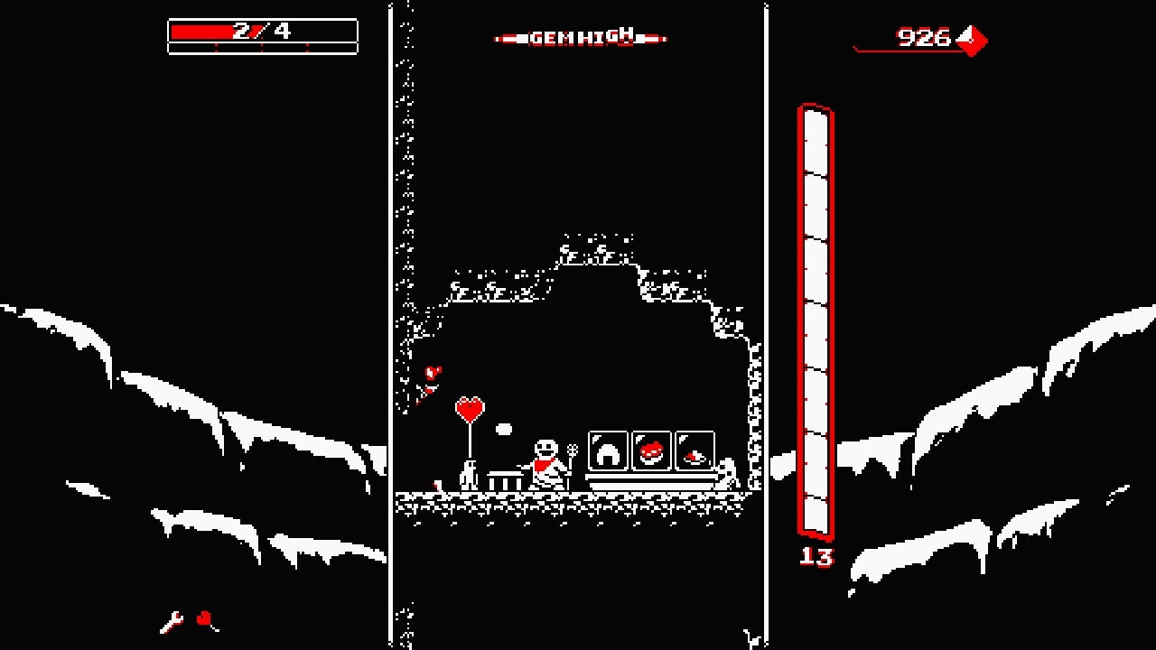 Occasionally while falling, you'll see a small platform jutting out from the side of the well with a little arc over it. That signifies a cave, which you can enter. Sometimes it contains a power-up that boosts your gunboots' ability, such as turning their shots into a powerful laser, or enabling them to shoot three bullets at a time. Very rarely it'll contain a shop that sells useful items, like an extra hit point that you can buy using the gems that are dropped by dispatched enemies.