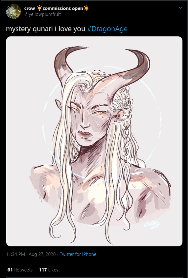 Just as fast as the theory-crafters and lore nerds (I say this as one of them) were the artists, who found a new muse in this Qunari warrior. Art of her seemed inevitable, as Twitter users immediately began crafting their own version of their mysterious Qunari infatuation.