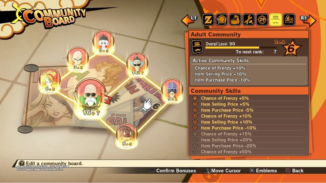 The Community Board is Dragon Ball Z Kakarot’s way of showing how the Z Fighters’ support for each other brings out their best in battle - letting you improve your party’s abilities with powerful buffs when you combine the right Spirit Emblems.