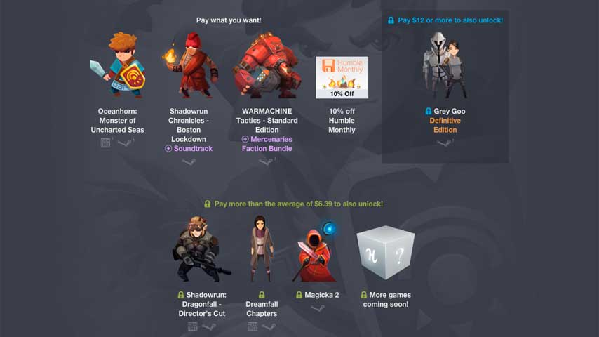 Pay what you want for Oceanhorn: Monster of Uncharted Seas, Shadowrun Chronicles - Boston Lockdown and Warmachine Tactics - Standard Edition plus the Mercenaries Faction Bundle. This tier also includes a voucher for 10% off the Humble Monthly subscription.