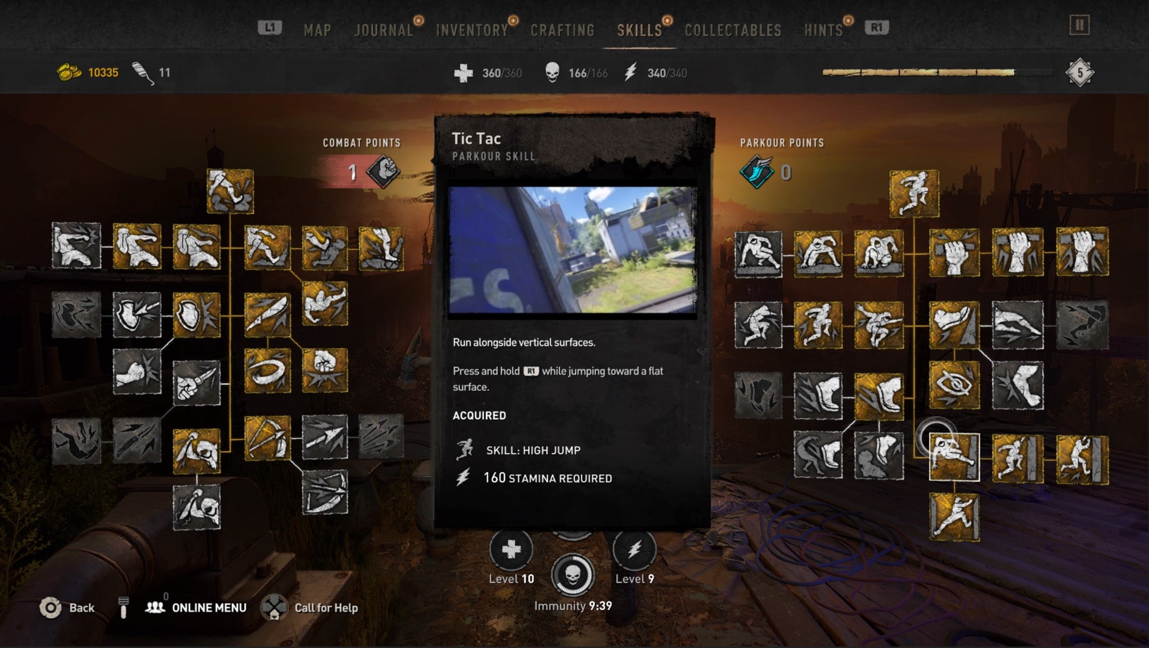 Finally, at the bottom of the Parkour Tree, the cluster of 4 skills leading on from Tic Tac are all worth investing in once you have enough Stamina.Tic Tac and Wall Combo both open up some fun traversal opportunities, but it’s Wall Run and Wall Run Jump that you really want.