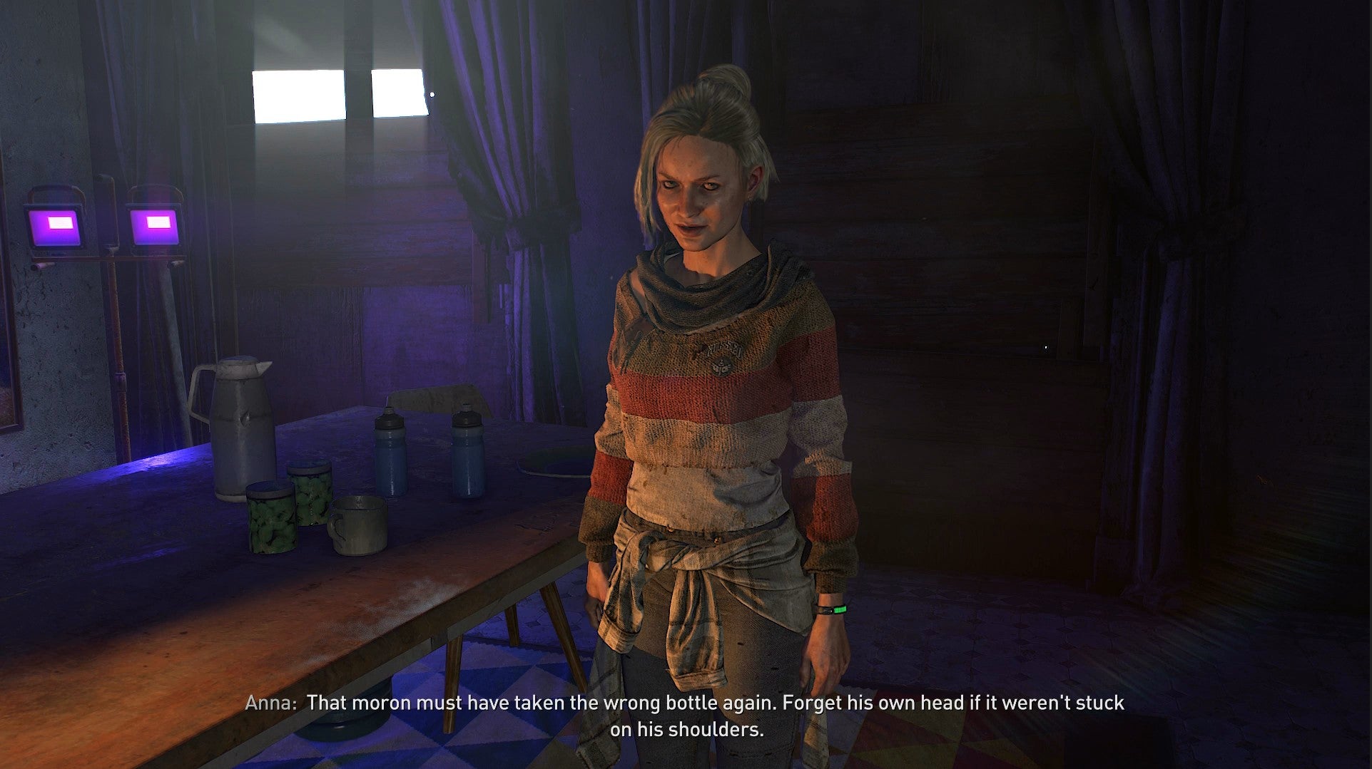 Hot-foot it over there and pick the easy lock on the door. Inside Hans’ house you will find UV lamps and a spluttering Anna, who’s just taken a gulp from a bottle.