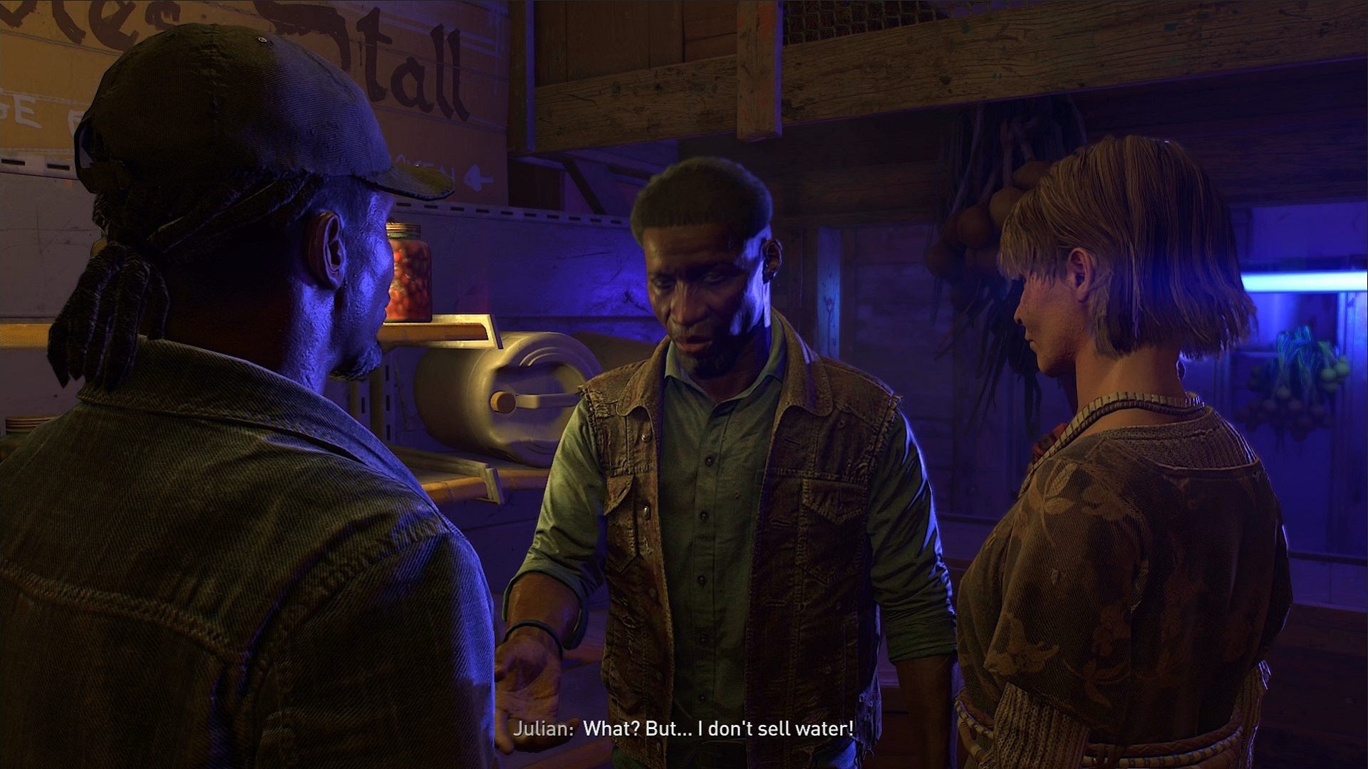 As you explore the Bazaar and meet its residents, you find two Survivors confronting a merchant, Julian, following their friend having taken ill after drinking some of his water.
