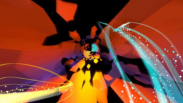 Entwined shares a similar aesthetic, but plays out in a different way. In the game you control a fish and a bird, two characters that can never be together, via the analog sticks. One character is controlled with the left stick, while the right stick controls the other. Both characters are flying into the screen at an unknown destination, with different colored gates to pass through. The aim is simple: pass the right character through the right gate. As you collect energy power-ups and successfully pass through gates, the characters become closer and closer together, eventually forming a majestic dragon.