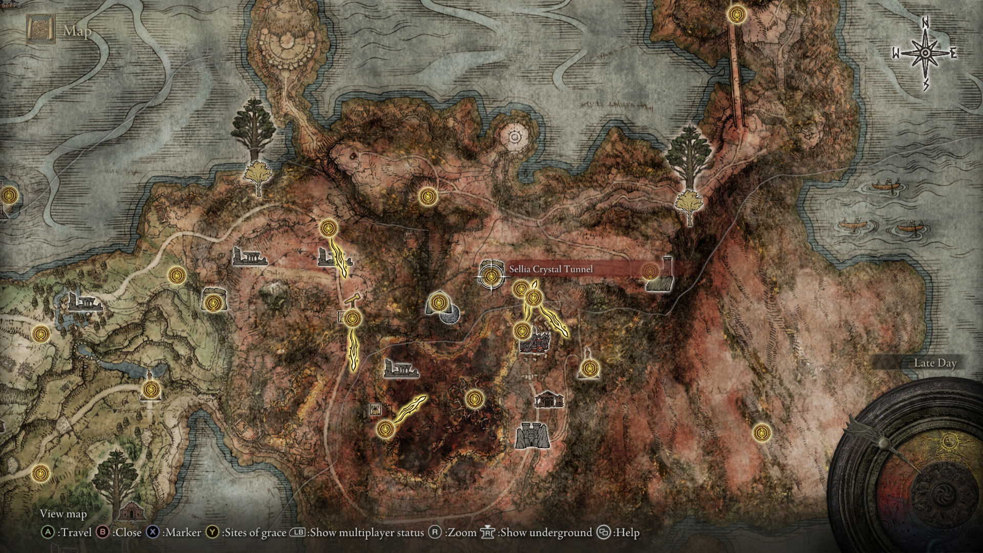 In this guide, we're going to be approaching Sellia Crystal Tunnels from its natural entrance, and not via the trapped chest in Limgrave. You can find the entrance to the tunnels north of Sellia, Town of Sorcery in Caelid - this is marked on the map below.
