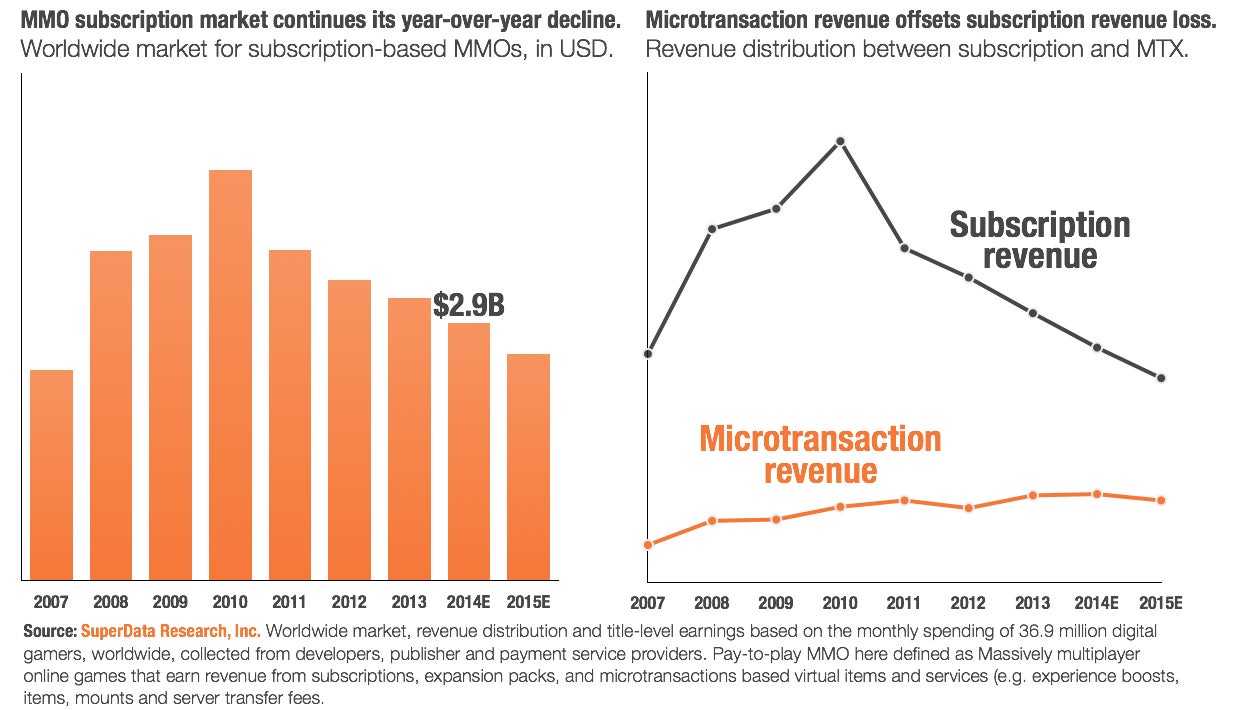 According to the firm, the pay-to-play MMO market has "been shrinking since 2010, dropping from $30.6 million monthly active subscribers worldwide to $23.4 million in 2014. The subscription MMO market has declined to $2.9 billion, with average spend at $170.