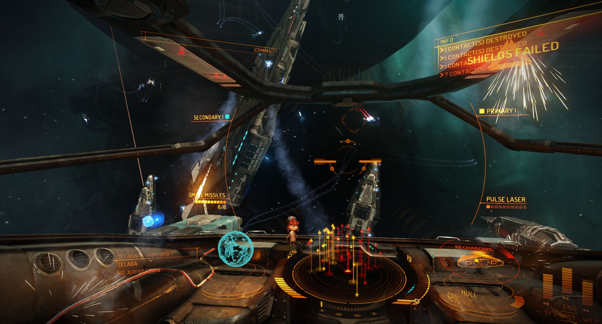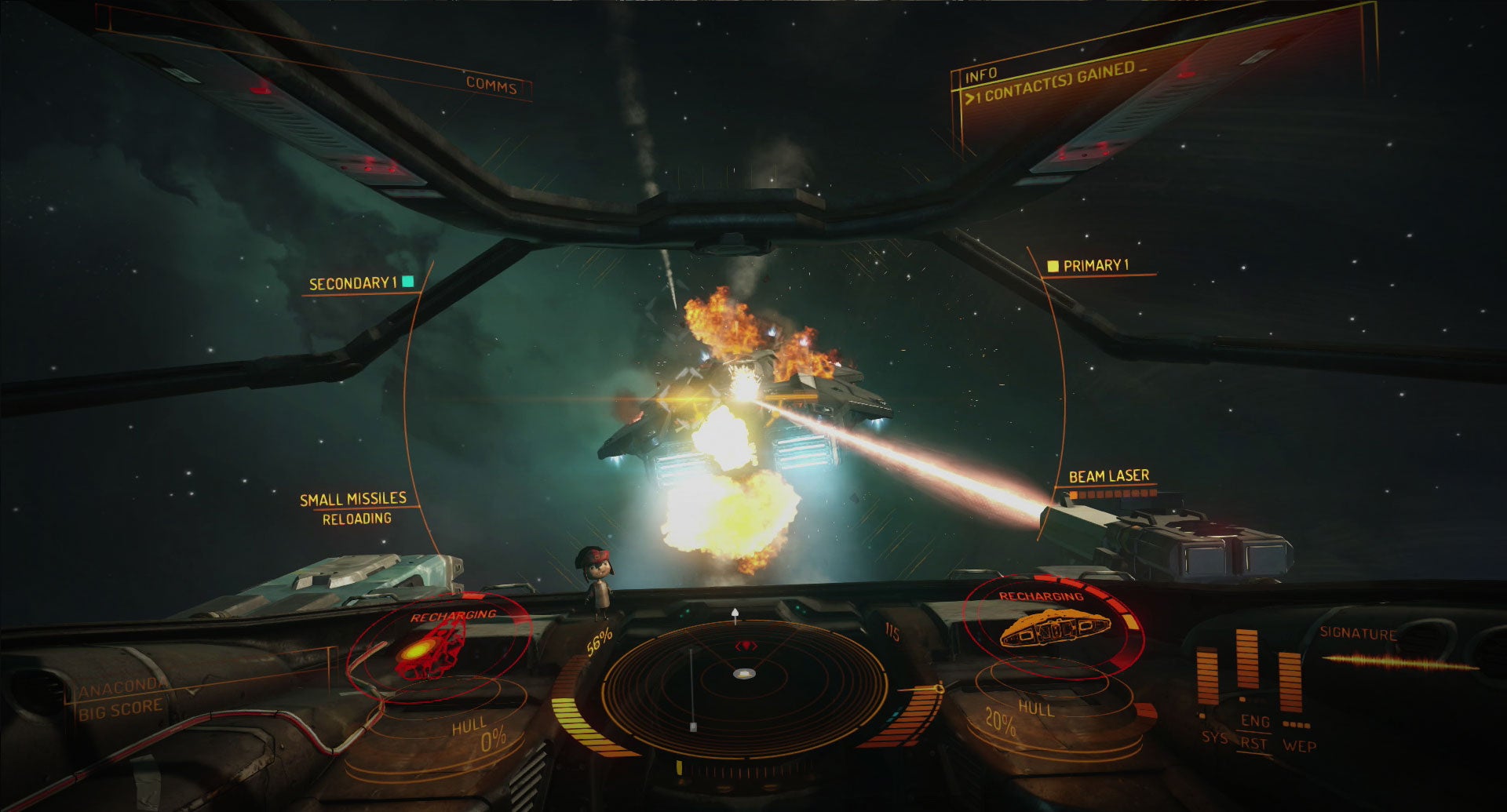 After some searching, I eventually found a pirate in one of the many Unidentified Signal Sources floating around every system—essentially an instanced event in which its possible to collect contraband cargo or fight CPU opponents. I eagerly opened up my hardpoints... and suddenly had every system go to zero. My weapons were drawing too much power for my measly power plant to handle. In the meantime, the pirate was peppering me with weapons fire and cracks were forming in my canopy. The next thing I knew, I was eating raw vacuum.