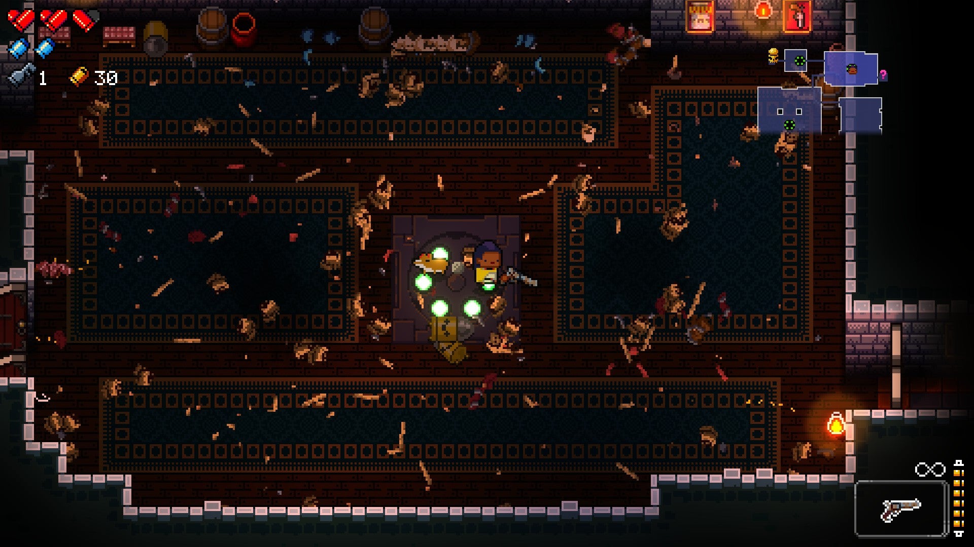 VisualsThe pixel art looks simple, but there's a lot going on here. Leaves fall, barrels break, and reflections star back at you from puddles. Enter the Gungeon's attention to detail is amazing.