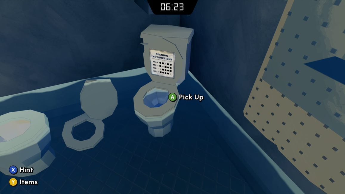 This opens the lightning bolt box next to the exit. To get to the handle, go to the safe behind the boxes of junk in the middle of the room, the method to open it is inside the toilet seat next to the pin boards.