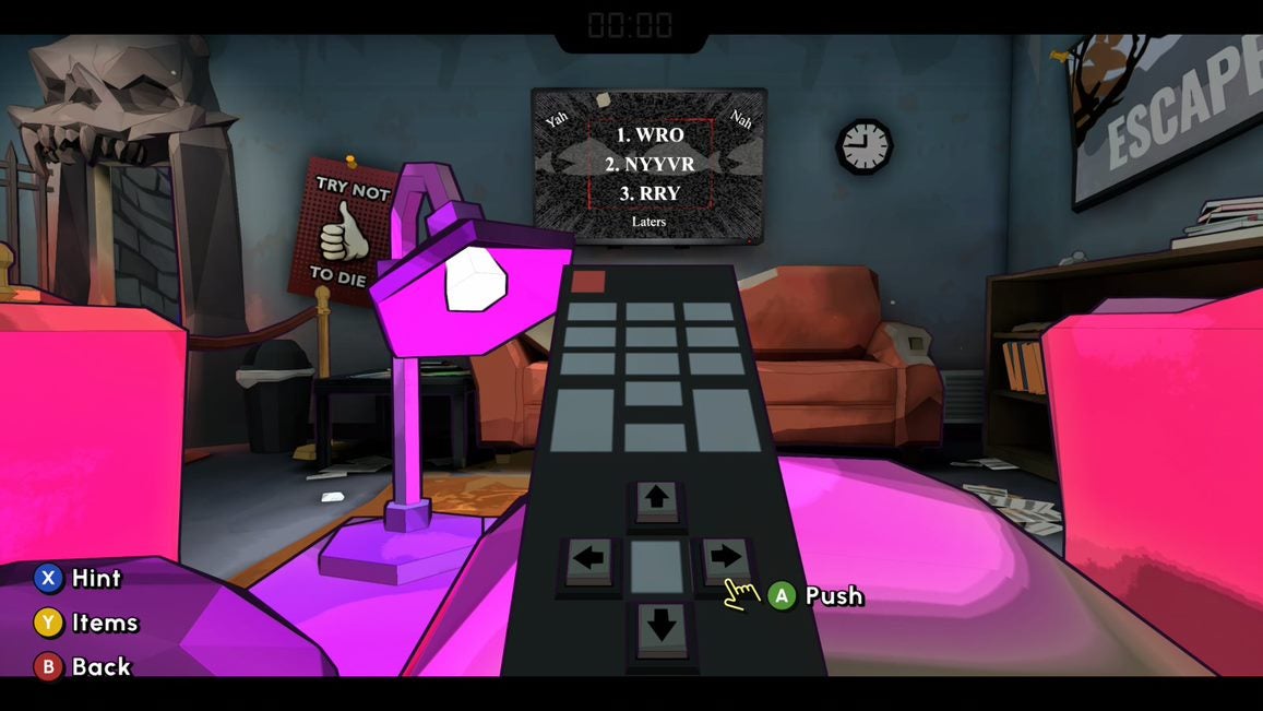 Look to your right and take not of the directions on the merch. Press the directions on the shirts on the wall into the TV remote on the left. Mine were: up, right, down, up, right.