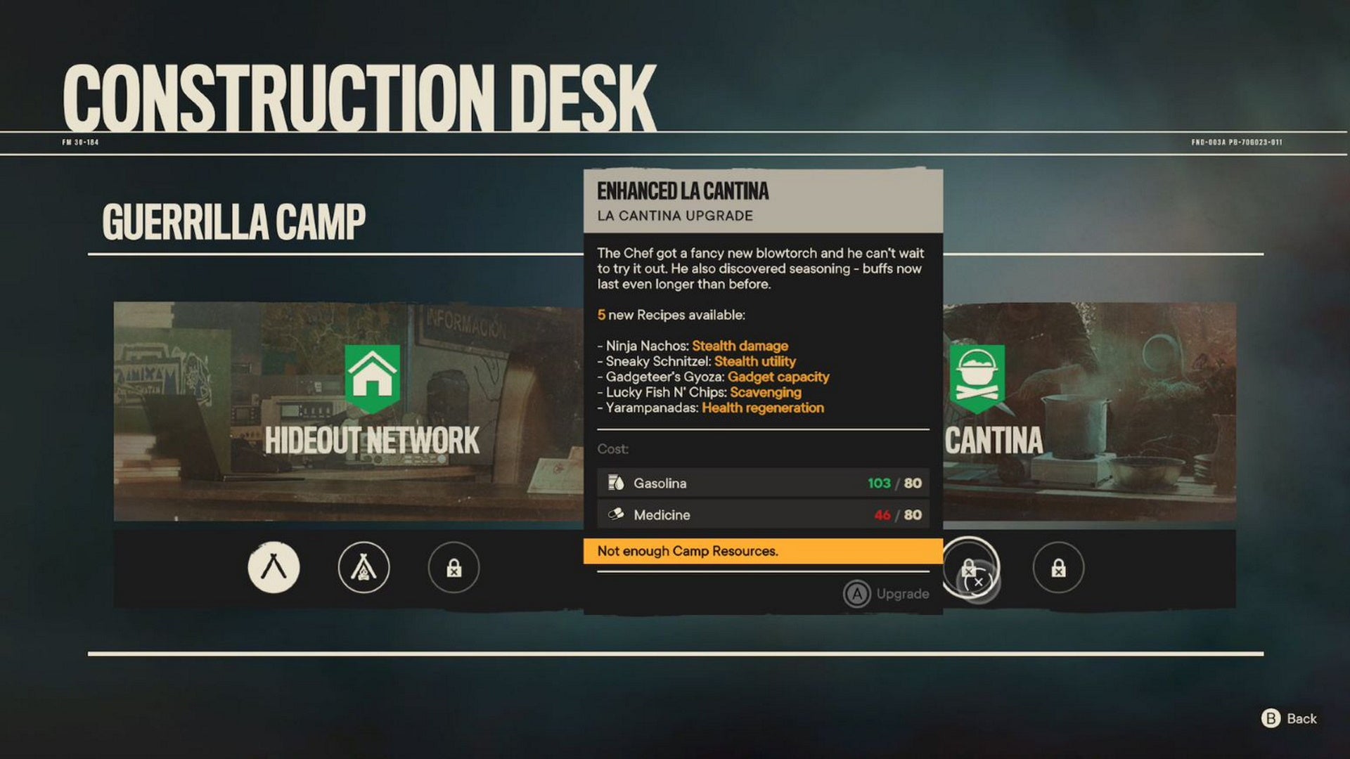 | Guerilla Garrison | 60 Metal, 60 Gasolina | Supplies your guerillas with better weapons and unlocks laptops for scouting FND bases |