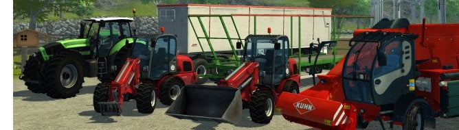 Giants and Focus Home Interactive have announced Farming Simulator 2013 is coming to consoles. The game retains what made the 2011 version such a hit, yet the developers have also added new machines, vehicles from 20 top manufacturers, crops, animals, and environments. Larger farm machinery will be unveiled at gamescom next month. The 2013 version also contains a new online mode and services, allowing the community to download and share mods, vehicles, and equipment, as well as custom made tools through the customization options in the game. Farming Simulator 2013 lands on PC in October, and will arrive on PS3 and Xbox 360 during Q1 2013. Shots are below.