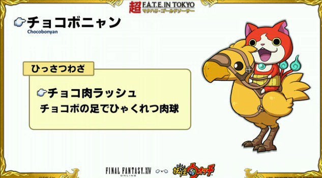 Meanwhile, over in the Nintendo 3DS Yo-Kai Watch game, you'll find two two new yo-kai. The first is Chocobonyan which is basically Jibanyan riding a chocobo, and the second is Mooglinyan, who looks just like a Moogle.