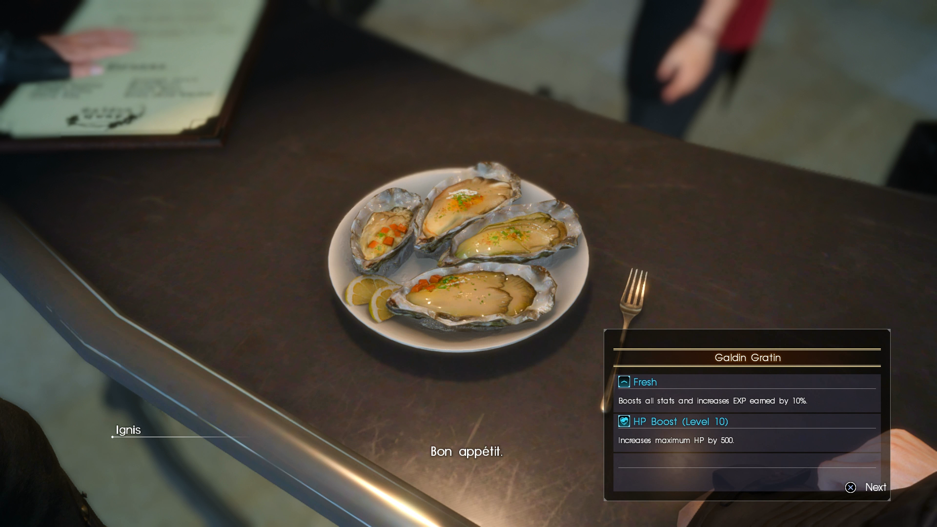 - Royal Banquet Canape: +50% EXP; Ignis ; Fine Caviar Canape eaten, Arapaima Roe, Kettier Ginger, and Allural Shallot