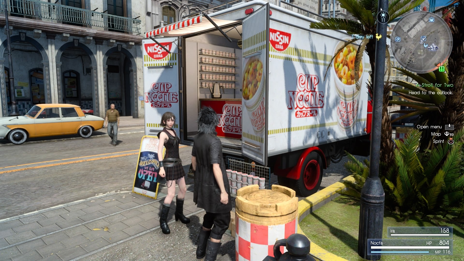 Playing Final Fantasy XV feels like a constant trade-off, where for every positive, are a heap of negatives. For instance, the automated camera from Prompto is a neat idea for game screenshots; taking the control directly out of the player's hands, but giving them something to remember the journey by regardless. On the other hand, a lot of the photos are horrible, which adds charm sometimes—like an overexposed selfie—but other times just reminded me that Prompto is just a bundle of AI, not my IRL road tripping buddie. In another detail, a road tripping JRPG in an open world is a fantastic set-up, complete with gas stations, bad diner food, and Coleman-branded camping. But the actual act of driving is a nuisance—which has since been sorta-patched in an update—where driving is slow with your vehicle stuck strictly to paved roads and nothing else. Eventually though, the car can fly, because this is a Final Fantasy game.