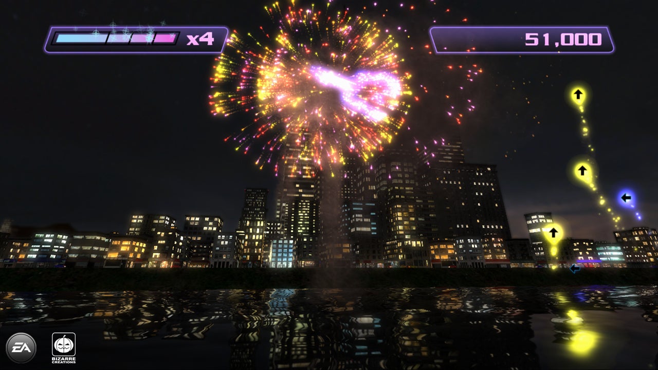 As the game camera gently pans across a stylized, neon cityscape, fireworks with buttons and colors marked on them launch into the sky towards a guideline at the top of the screen. By pressing the buttons at the right time, as the fireworks cross the line, you score points and build up a bonus meter. Miss them and you'll bring yourself closer to failure.