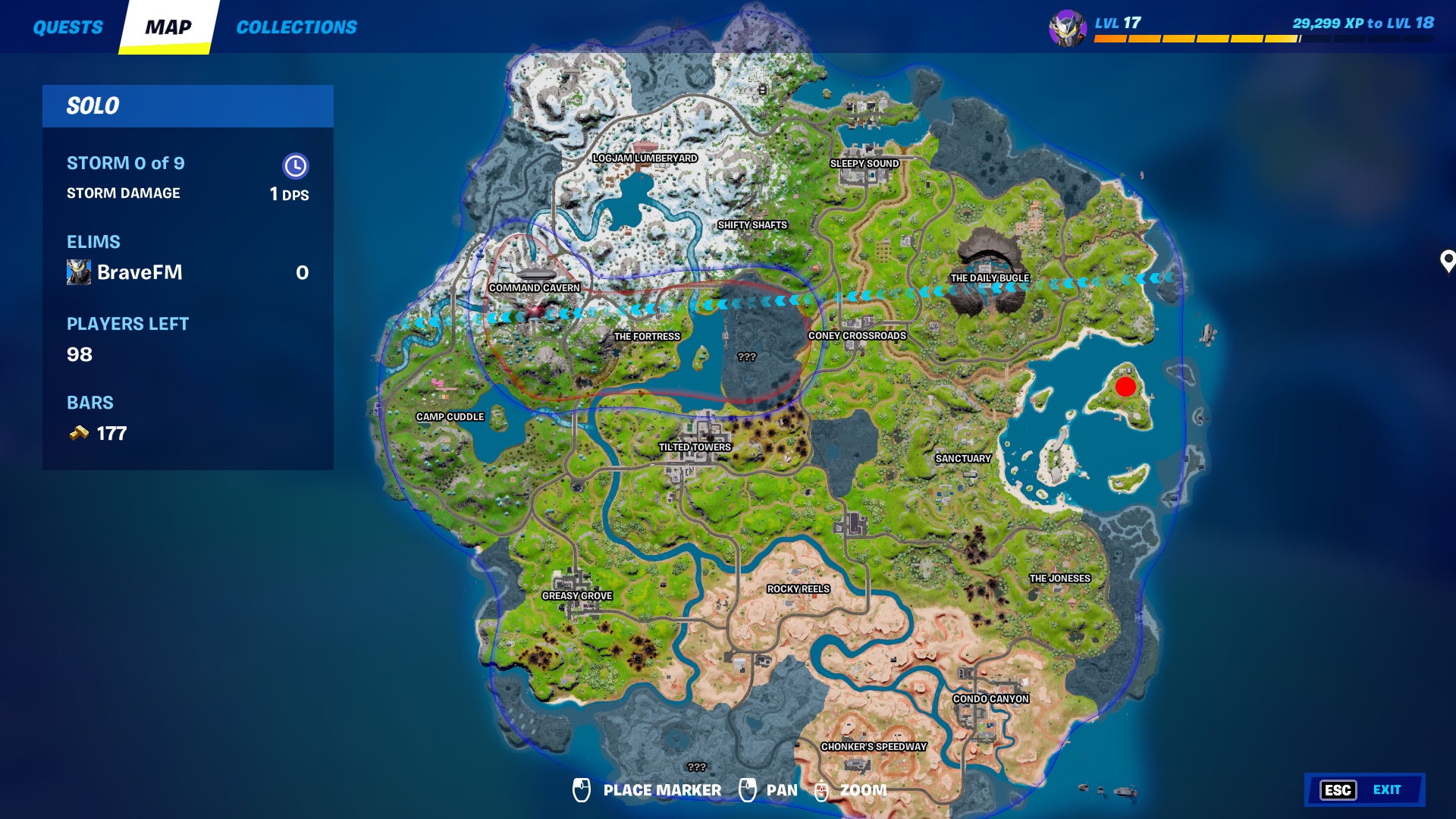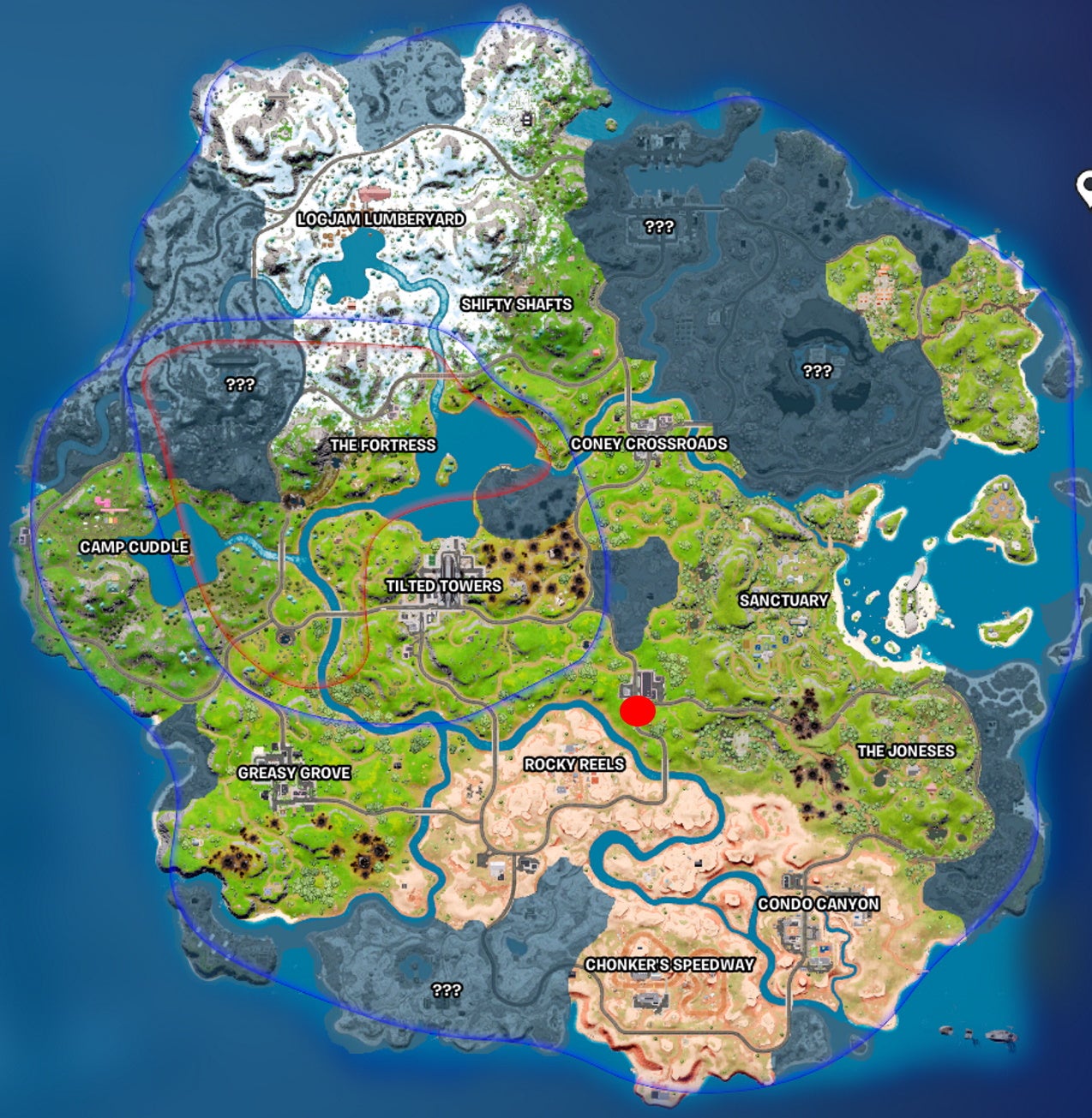 This one is southwest of the restaurant in the center of Greasy Grove, near the edge of the map. Since it’s in the middle of nowhere, it’s best to drop here first and make your way to areas less drastically affected by the storm.