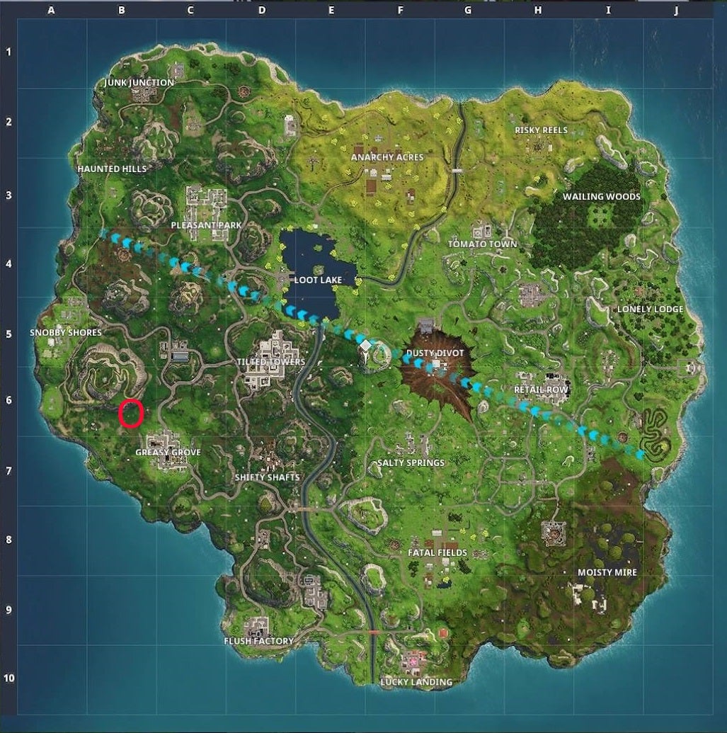 Now you just need to know where the campsite is and you can lock down the location of the Battle Star. The campsite is on top of the mountain to the north of Greasy Grove.
