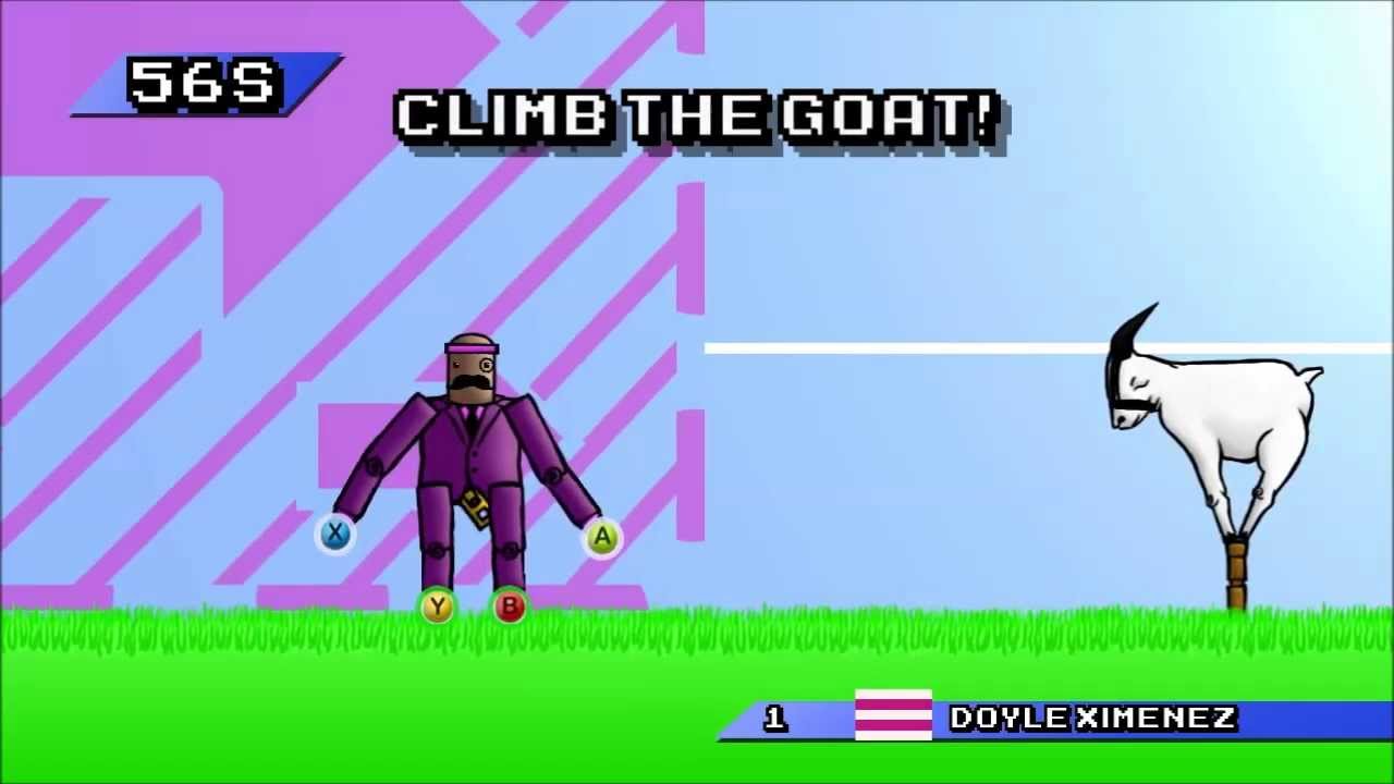 Steger -- one of the few developers to earn a living from selling Xbox Live Indie Games -- had low expectations for the weekend in terms of creating a sellable product. "Most TOJam games I make aren't worth talking much about," he says. "Even the ones I've gone on to sell have performed poorly." But Steger immediately had an idea that he thought would work well with the theme: a competitive game in which players took turns to create a tower of bodybuilders. Steger borrowed the control system from Bennett Foddy's QWOP, whereby four different buttons each control one of the character's limbs. Players must use a combination of inertia and limb-swinging to hoist their character up the sticky mound of bodies (all of which stand, inexplicably, on the back of a mountain goat). When a player's character makes it to the top, control switches to the next player, and so on until someone falls off or fails to reach the summit within the time limit.