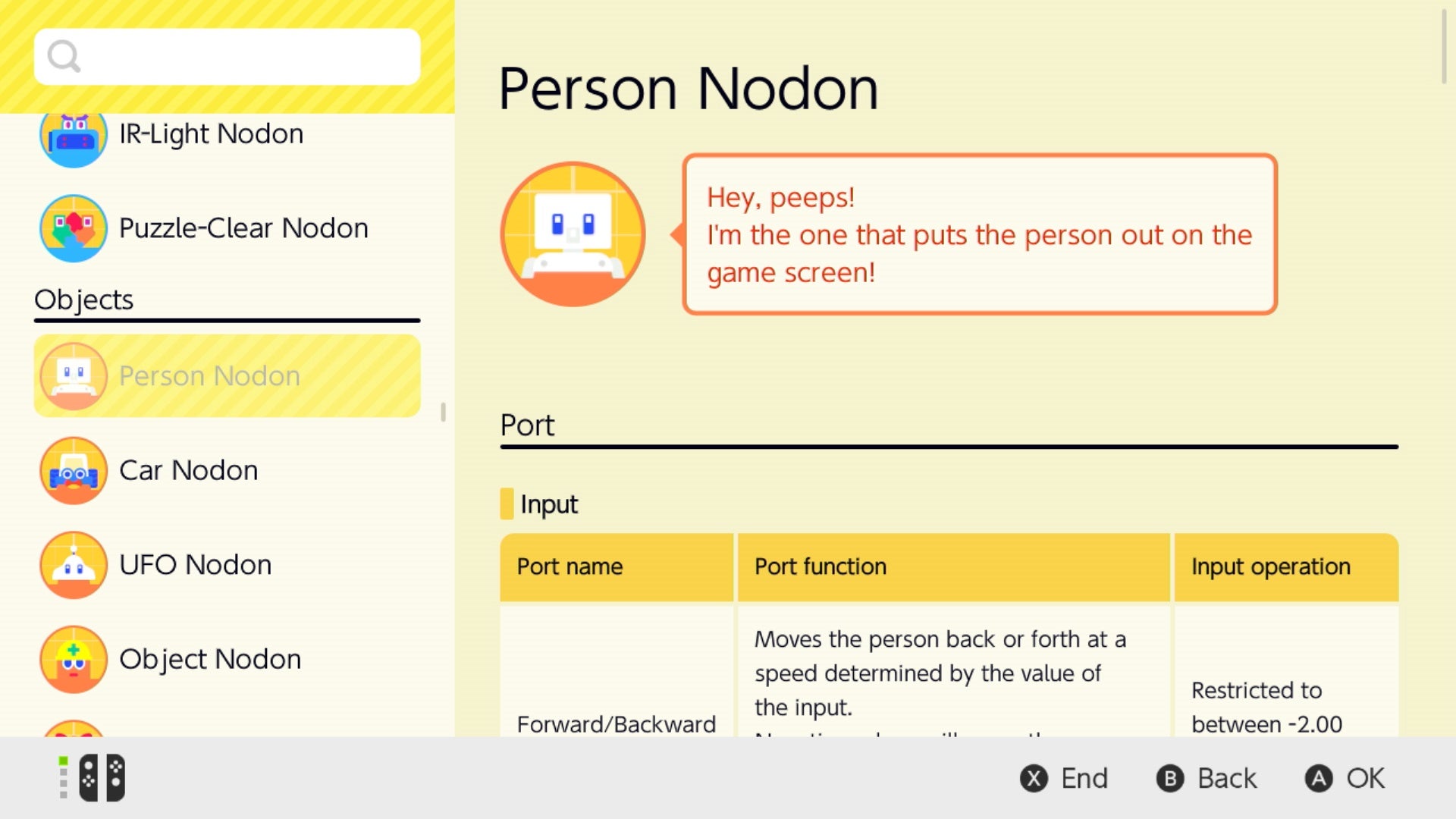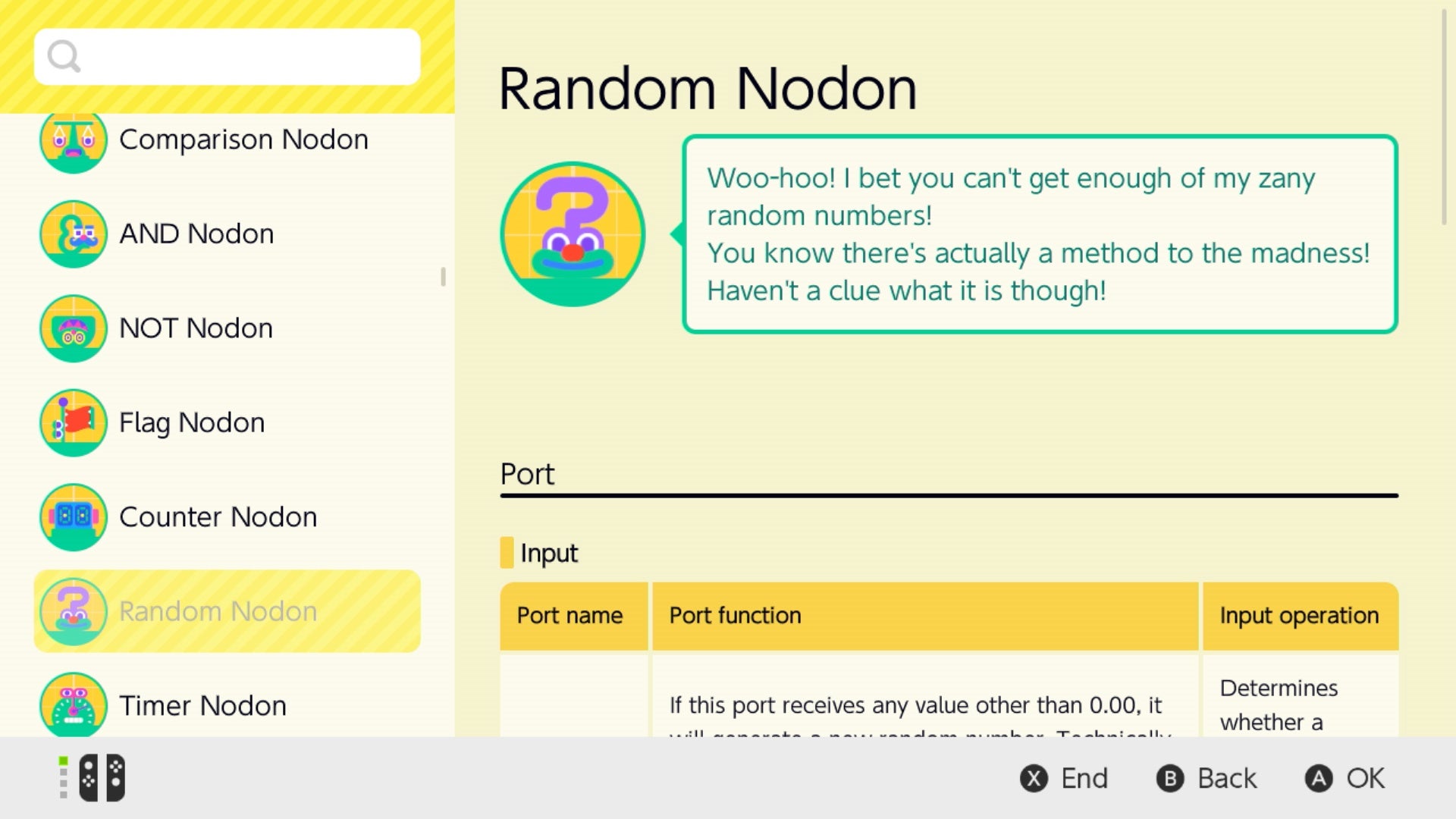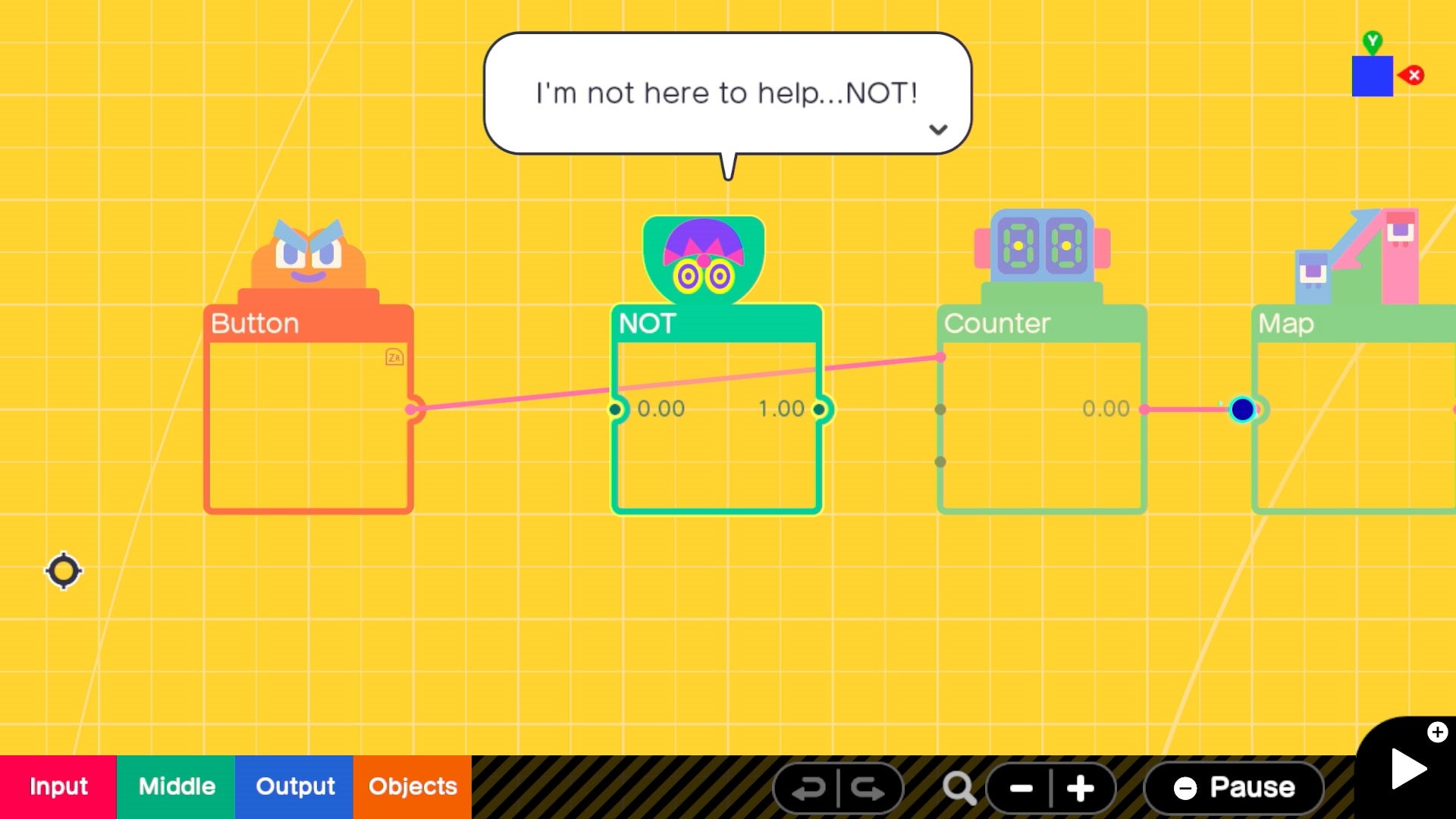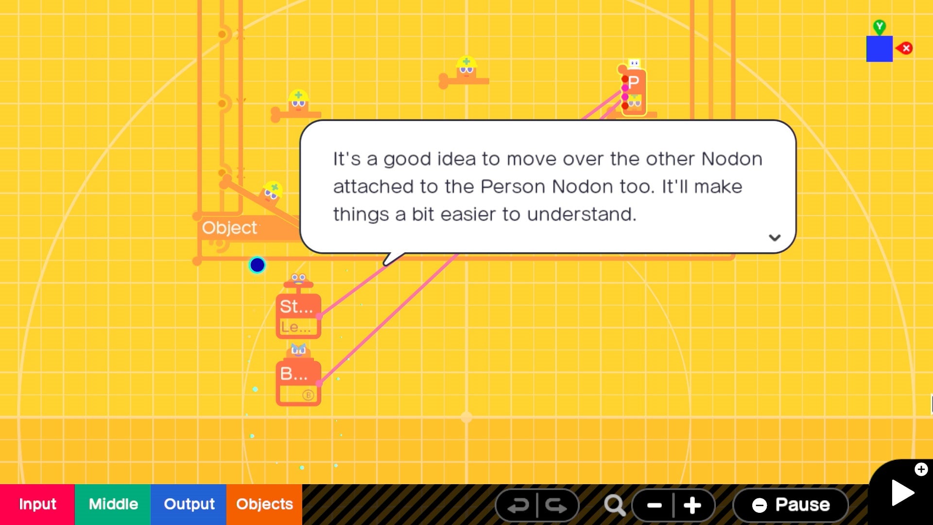 The Nodon talk, make jokes, and each have little personalities. The A button is excitable, bouncy, and always wants to be pressed and part of the action. The retry button is humdrum and depressed, always thinking about how things could be better if they had a do-over - and so on. One Nodon even exists simply to string different levels and creations together - which means you could build a whole game that funnels you from one stage to the next seamlessly.