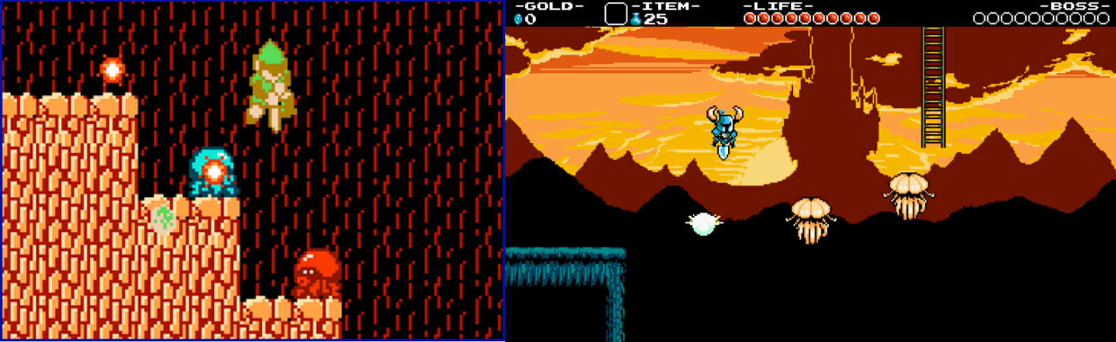 Shovel Knight's attack mechanics, which include extensive melee combat and a downward shovel stab, seem to be inspired by Link's stylish moves in Zelda II: The Adventure of Link.