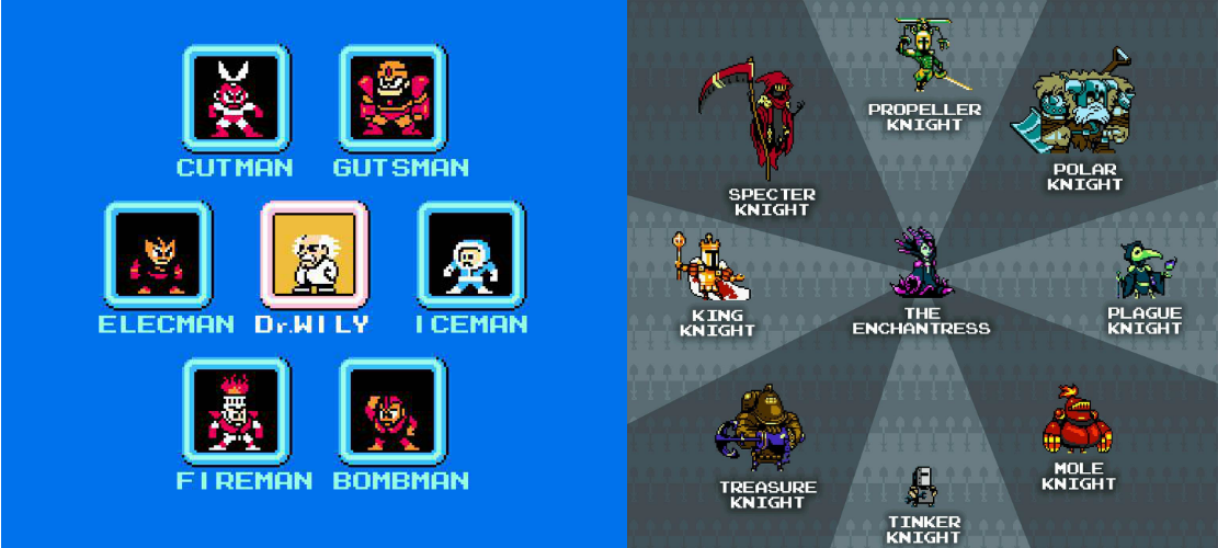 Shovel Knight brings back the pick-your-poison boss style that Capcom's Mega Man gave to world so long ago. Each boss has their own specific theme and a title that ties them together; while Mega Man's Robot Masters all had "Man" in their names, Shovel Knight's Order of No Quarter sticks with the "Knight" moniker.