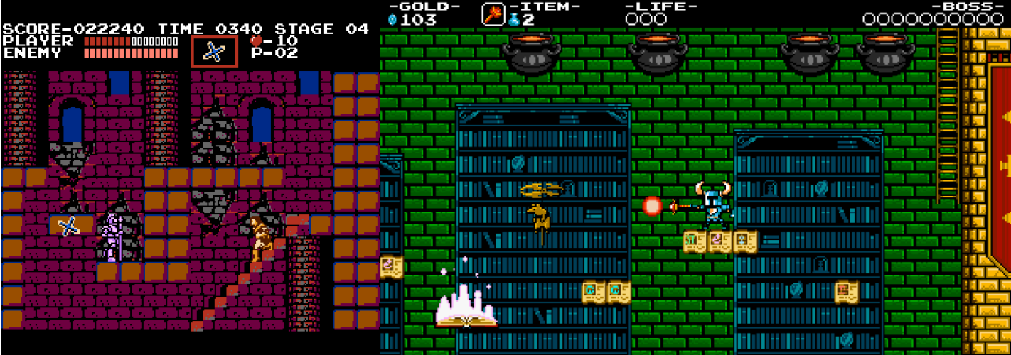 We definitely were struck by Castlevania's use of items. It's interesting that they aren't forced on you, but play a major part in how you can tackle each scenario and enemy in the game. There's always a clever way to use whatever weapon you have. In Shovel Knight, we took this idea and extended it even further. The items are useful in lots of ways, whether it be for platforming, enemies, or bosses. It's been interesting over the course of development how much people attach themselves to certain items based on their playstyle, which is very much in the vein of Castlevania. And you press Up and Attack to use them...so yeah, it's a bit like Castlevania!