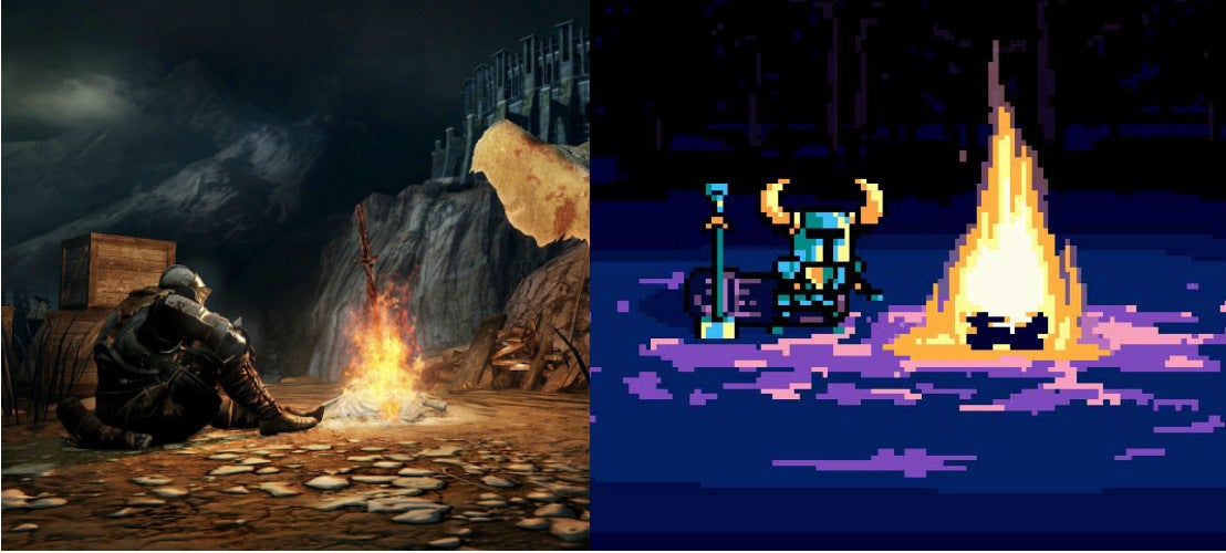 - Our checkpoint system might not directly remind you of Dark Souls, but the iteration of its design started from a place of thinking about how we could place such an important emphasis on player death as Dark Souls did. In our game, you can recover your lost money when you die similar to Dark Souls, but imagine if when you returned to the campfire, if you had the option of putting out the fire for a giant heap of cash! That's basically the risk/reward system we have set up. Any time you reach a checkpoint, you will return to it if you die, but you also have the option to break it with your shovel and benefit from a ton of gold instead.