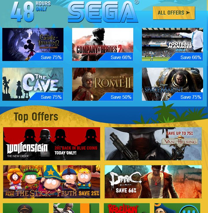 On the front page, there is a 48-hour SEGA sale featuring 75% on Castle of Illusion 2, Company of Heroes 2, The Cabe, Warhammer: Space Marine, 66% off on Football Manager 2014, and 50% off on Total War Rome 2.