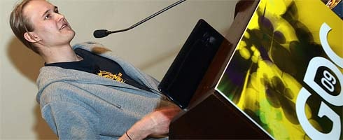 2DBoy's Ron Carmel was the star of the show, but you can see Crayon Physics guy Petri Purho and Stardock's Brad Wardell through there, as well as some pictures of 300 people that want to make millions of dollars by not talking to publishers.