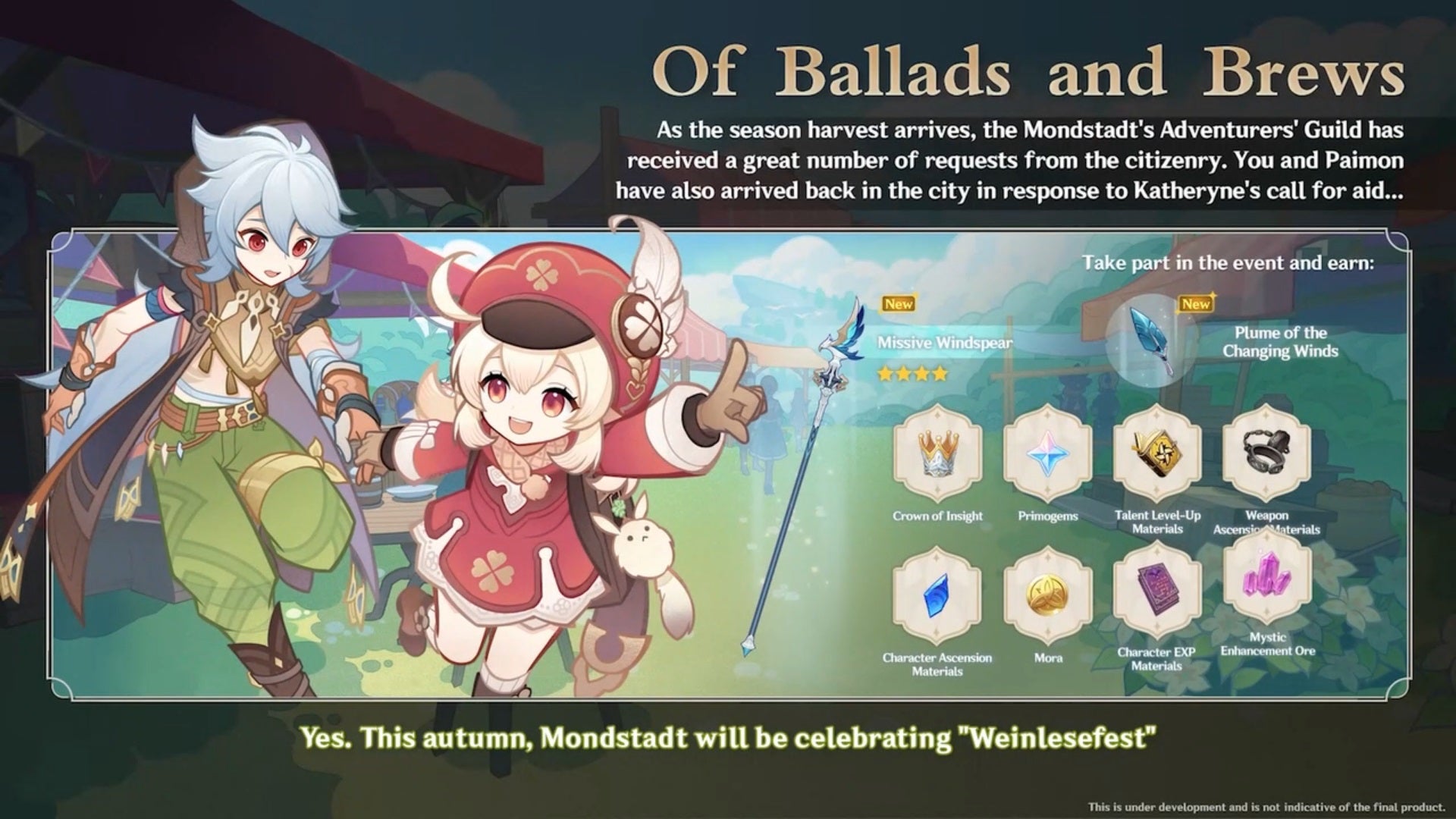 As Genshin fans have come to expect, version 3.1 will come with a series of exclusive new events for your to play/ All of them provide primo gems, upgrade materials, and mora. However completing the main festival quest set in Mondstadt will grant a special four-star polearm all players will desperately want to get their hands on!