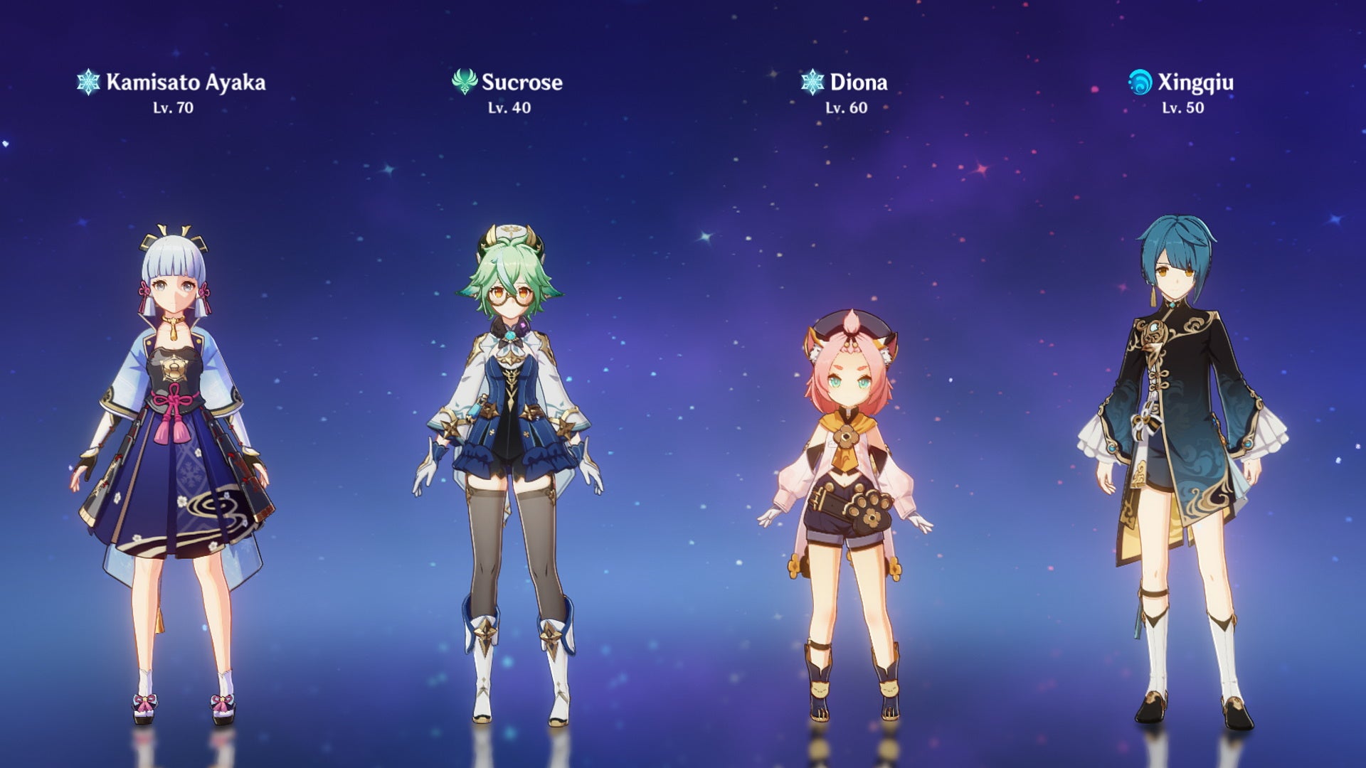 Main DPS: Ayaka Sub DPS: Xingqiu Support: Diona Sub DPS: Sucrose