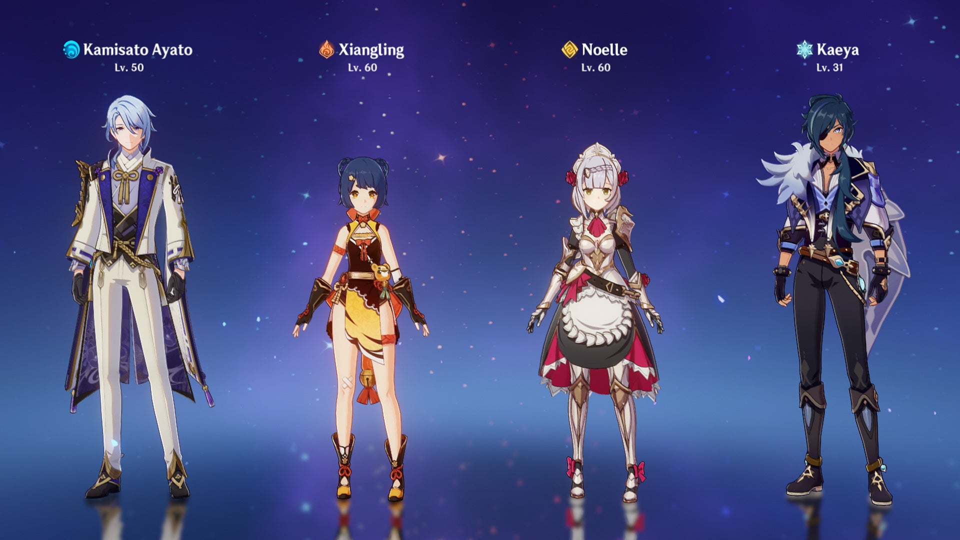 This team is a revolving Reaction team, where the idea is chaining Reactions by swapping party members to trigger their Skills and Bursts. Xiangling’s and Kaeya’s Bursts linger after they leave the field, creating opportunities for continuous Freeze and Vaporize Reactions when you switch to Ayato and use his skill.