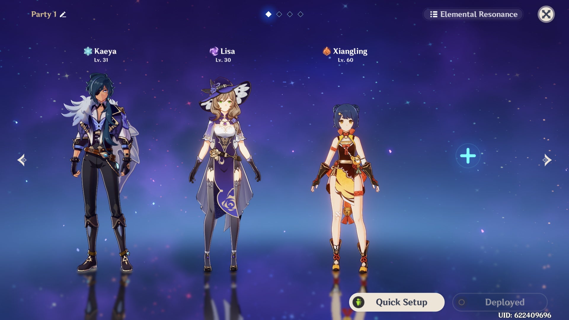 Lisa’s and Kaeya’s bursts create lasting fields of Electro and Cryo, respectively, which work nicely with Yoimiya’s Pyro output. Xiangling is there for the Fervent Flames resonance effect, which increases attack by 25 percent.
