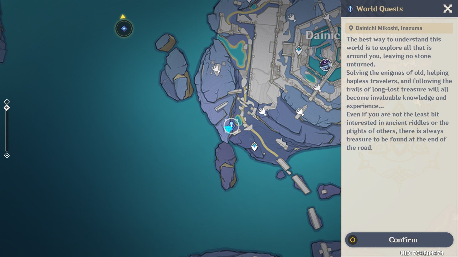 This one is simple enough! Start off at the Dainichi Mikoshi waypoint near where you first dropped the barrier on the island (south west of the island). There, head to the location shown in the image below to pick up the Antigonus world quest.