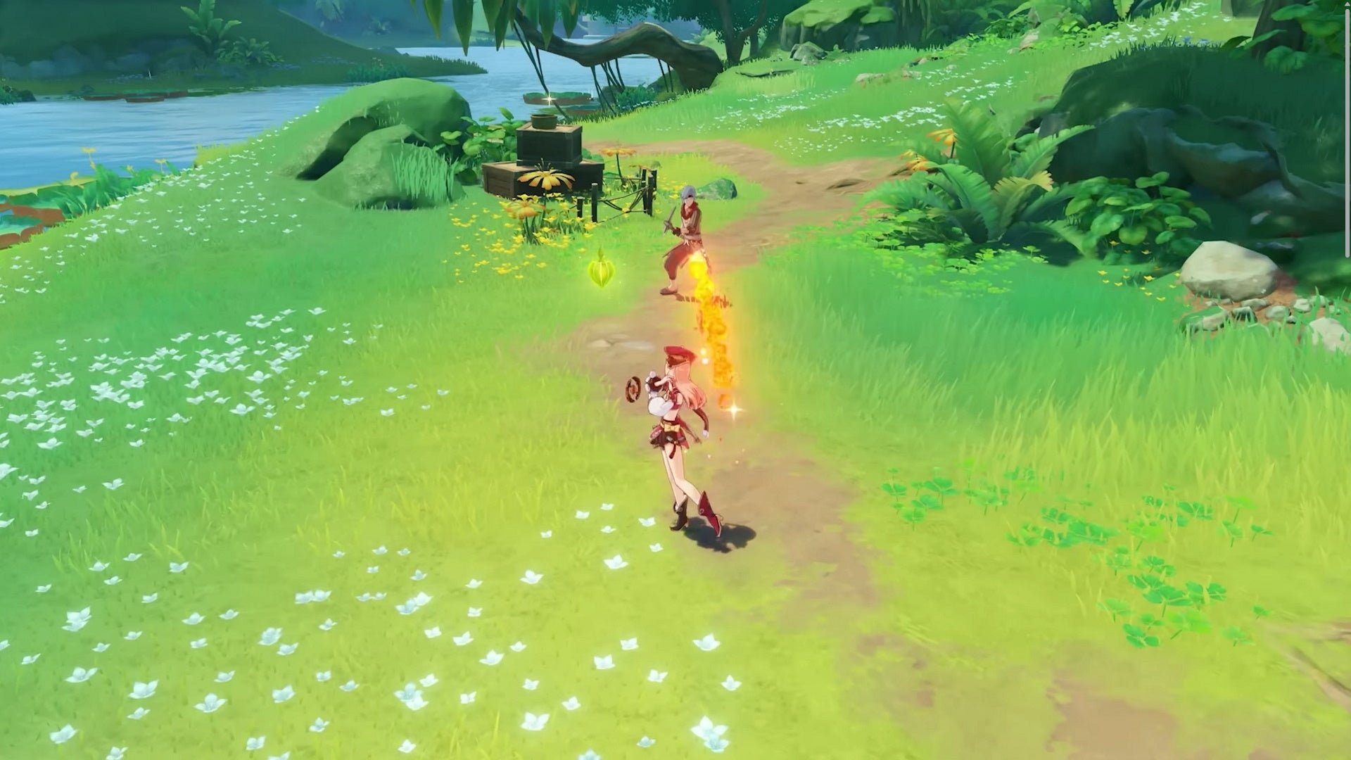 You may have seen Burning already, since it’s been present in Genshin Impact from the start. Burning deals continuous Pyro damage and, if the target is on grass, it will set the nearby grass on fire.